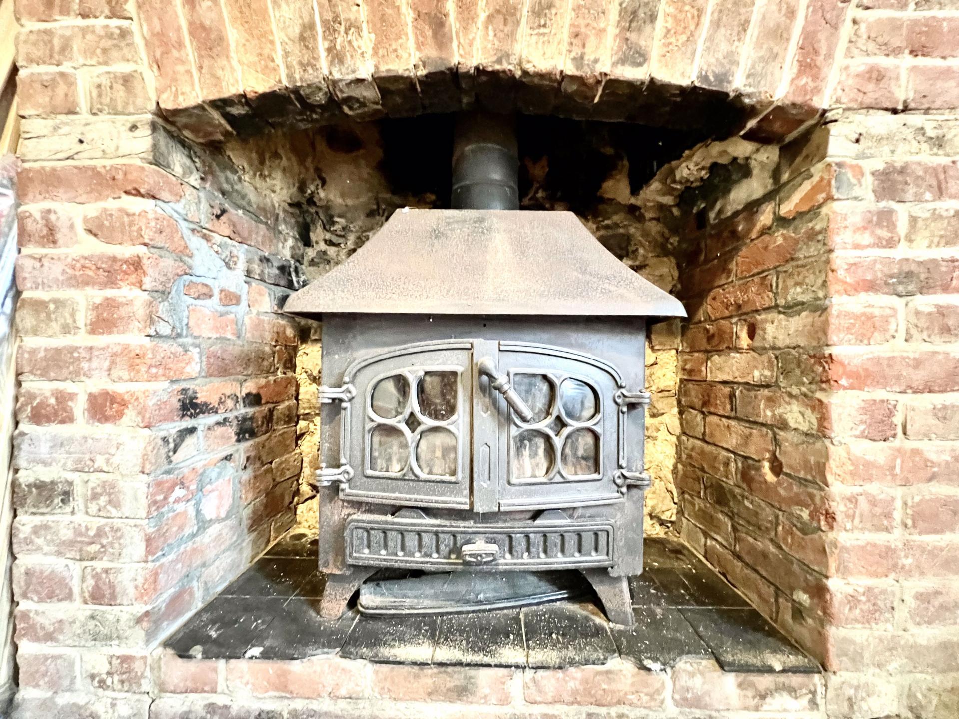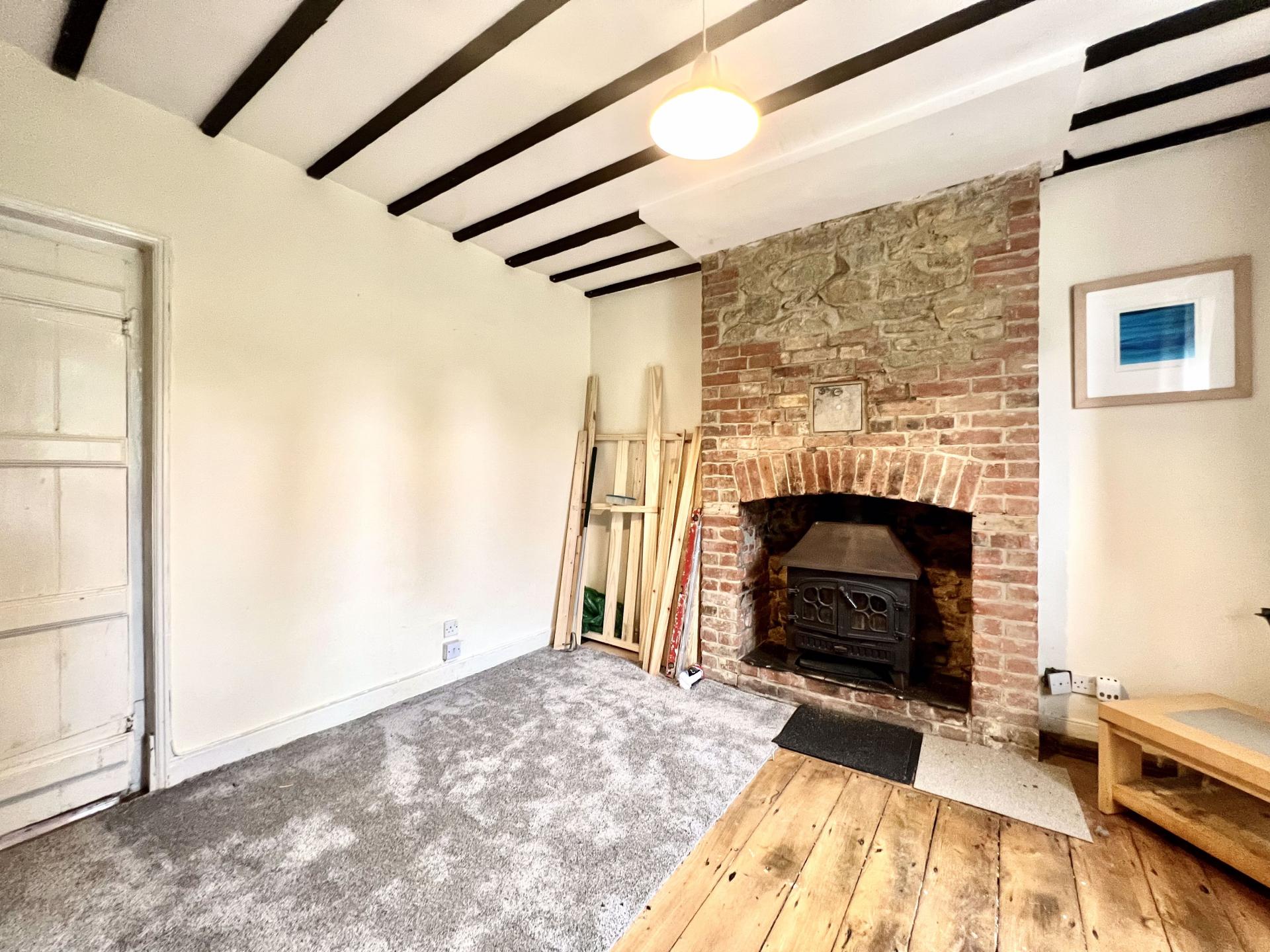 With Mullioned window to the front, feature brick fireplace with multi fuel stove, exposed beams, under stairs storage area, door to Kitchen original floorboards.