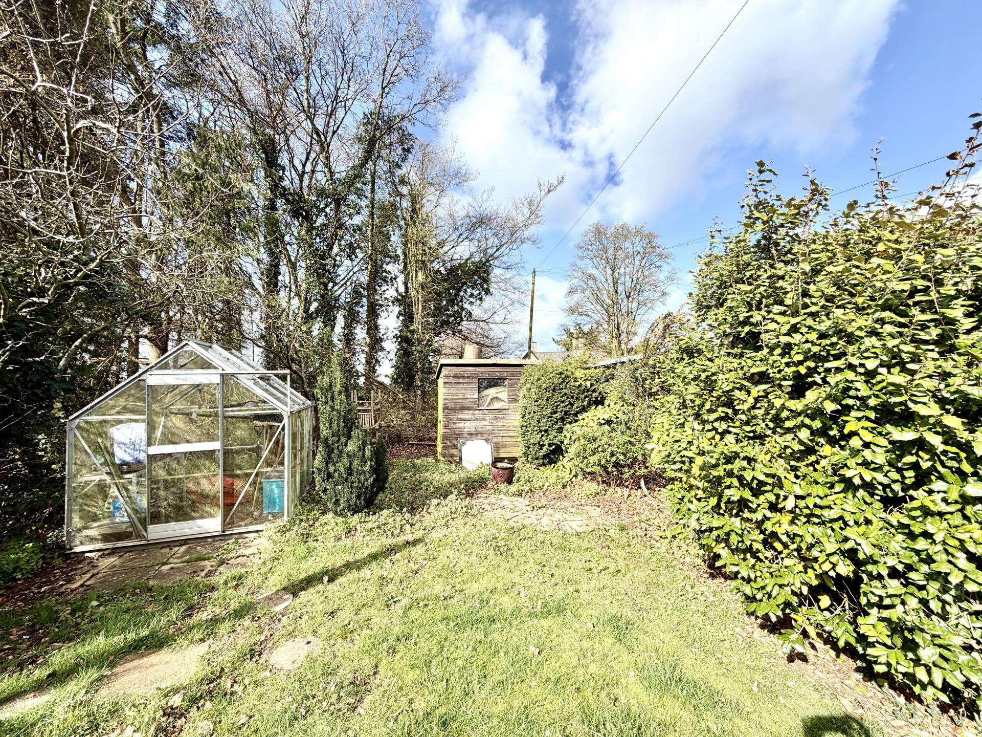 Stepping out from the conservatory, we walk over a gravelled storage area with private access for bins, bikes etc across the adjoining property. Steps up to a long lawned garden with a wealth of mature trees and shrubs, greenhouse and shed. There is also historic access to the field to the side, but we believe this is permissive only. The garden is indeed a lovely sunny private retreat.