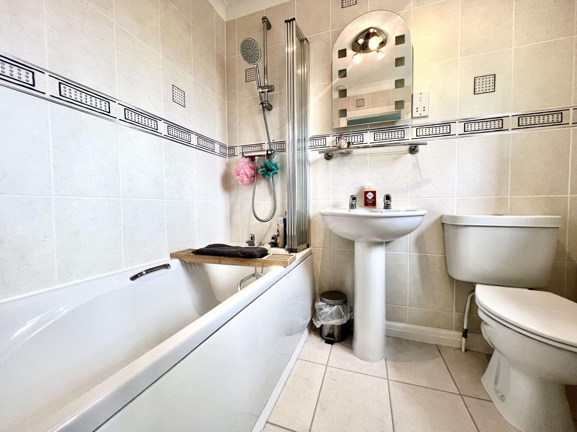 Upvc double glazed obscure window to rear, modern refitted suite comprising close coupled w.c., pedestal wash hand basin, panelled bath with shower and screen over, chrome towel radiator, fully tiled walls, tlled flooring.