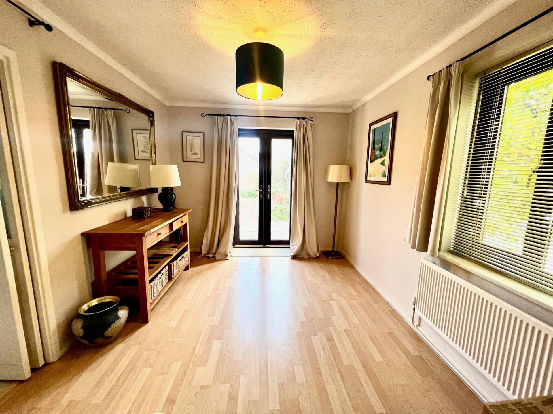 Upvc double glazed window to side, ceiling coving, door to kitchen, radiator, laminate flooring, upvc double glazed French doors to rear.