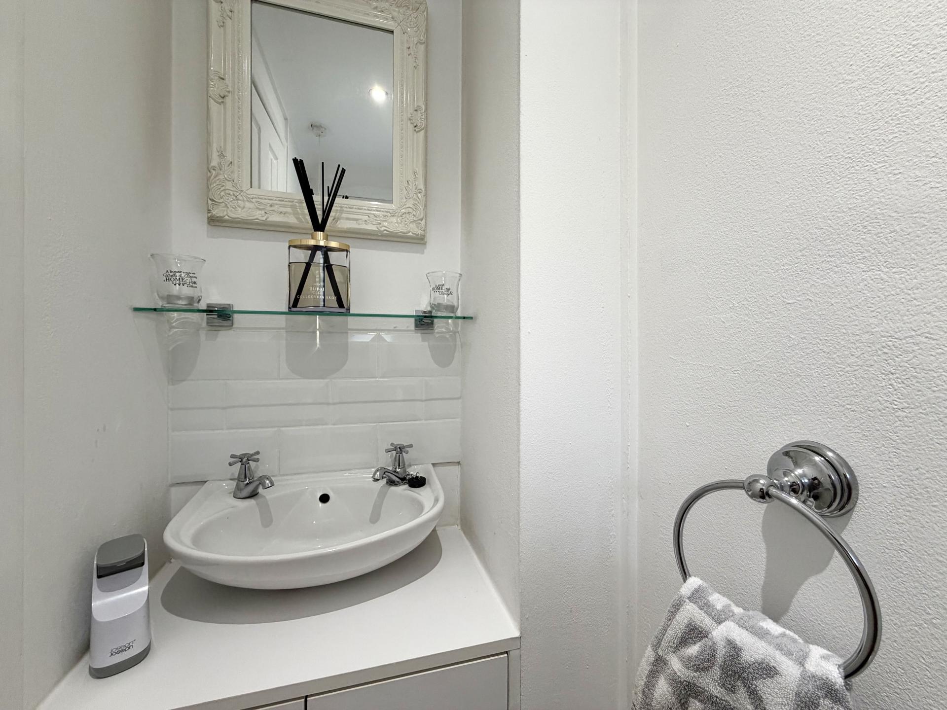 Upvc double glazed obscure window to side, modern refitted suite comprising close coupled hidden cistern w.c., inset ceramic sink with mixer tap, bath with shower over and glass shower screen, chrome towel radiator, fully tiled walls, tiled flooring.