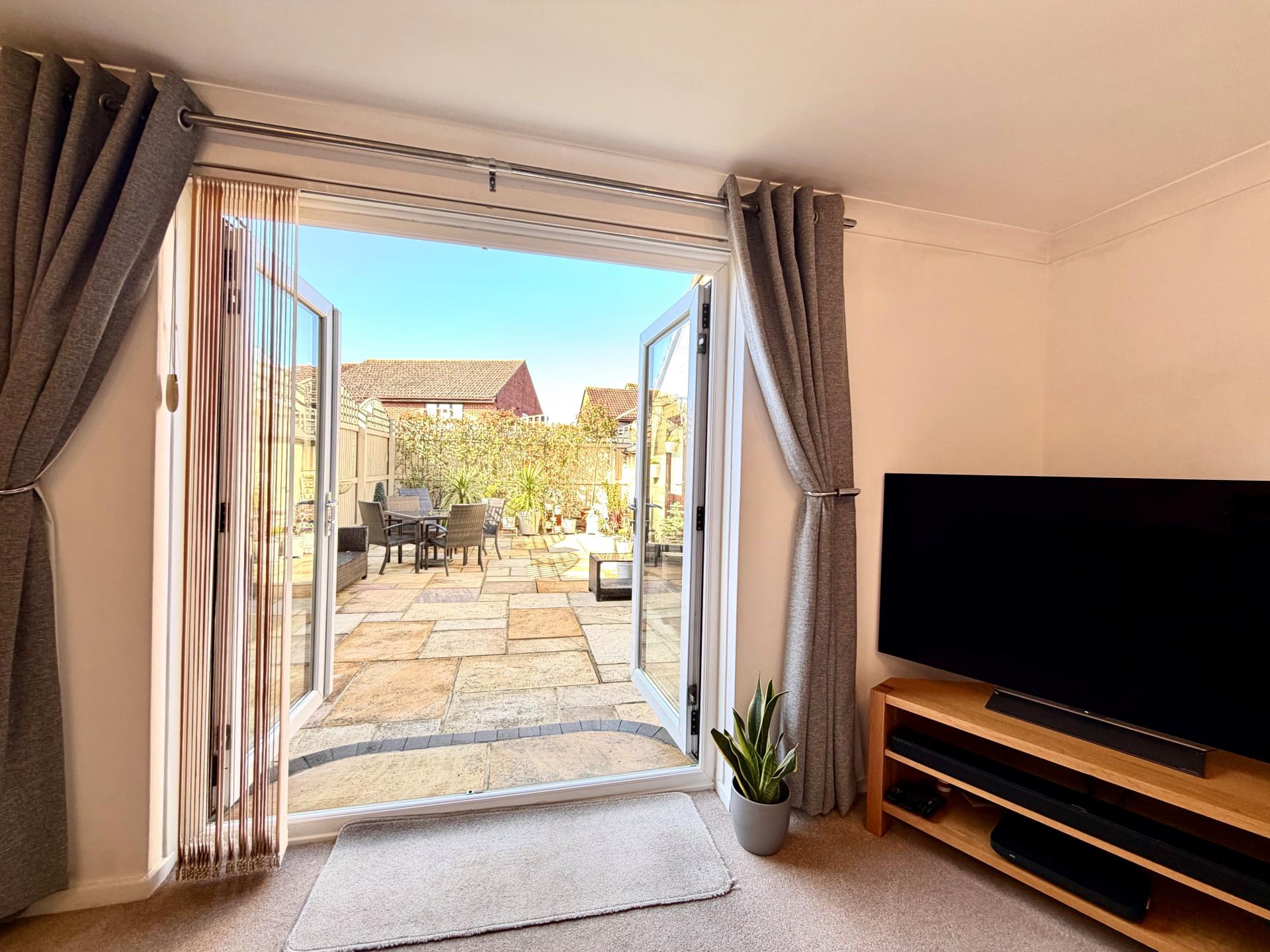 Upvc double glazed French patio doors opening out to the garden, air conditioning unit, radiator.