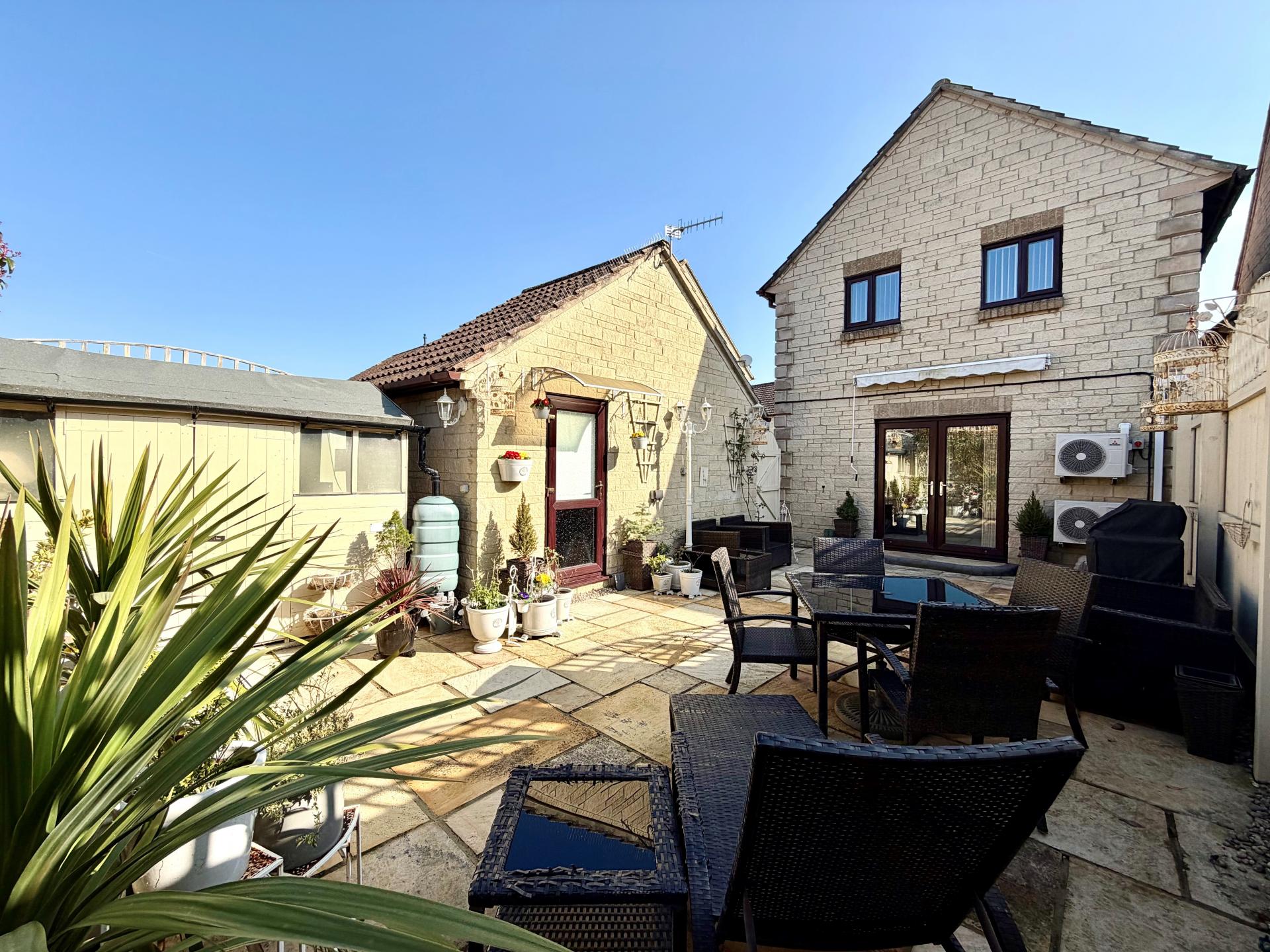 Fully enclosed and laid with Natural Indian Stone paving slabs, garden storage shed, obscured glass UPVC pedestrian door to garage, electric points, gated access to driveway.