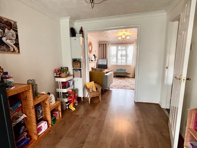 Stairs rising to first floor, doors to living room, kitchen and guest cloakroom, radiator, under stairs storage cupboard, laminate flooring.