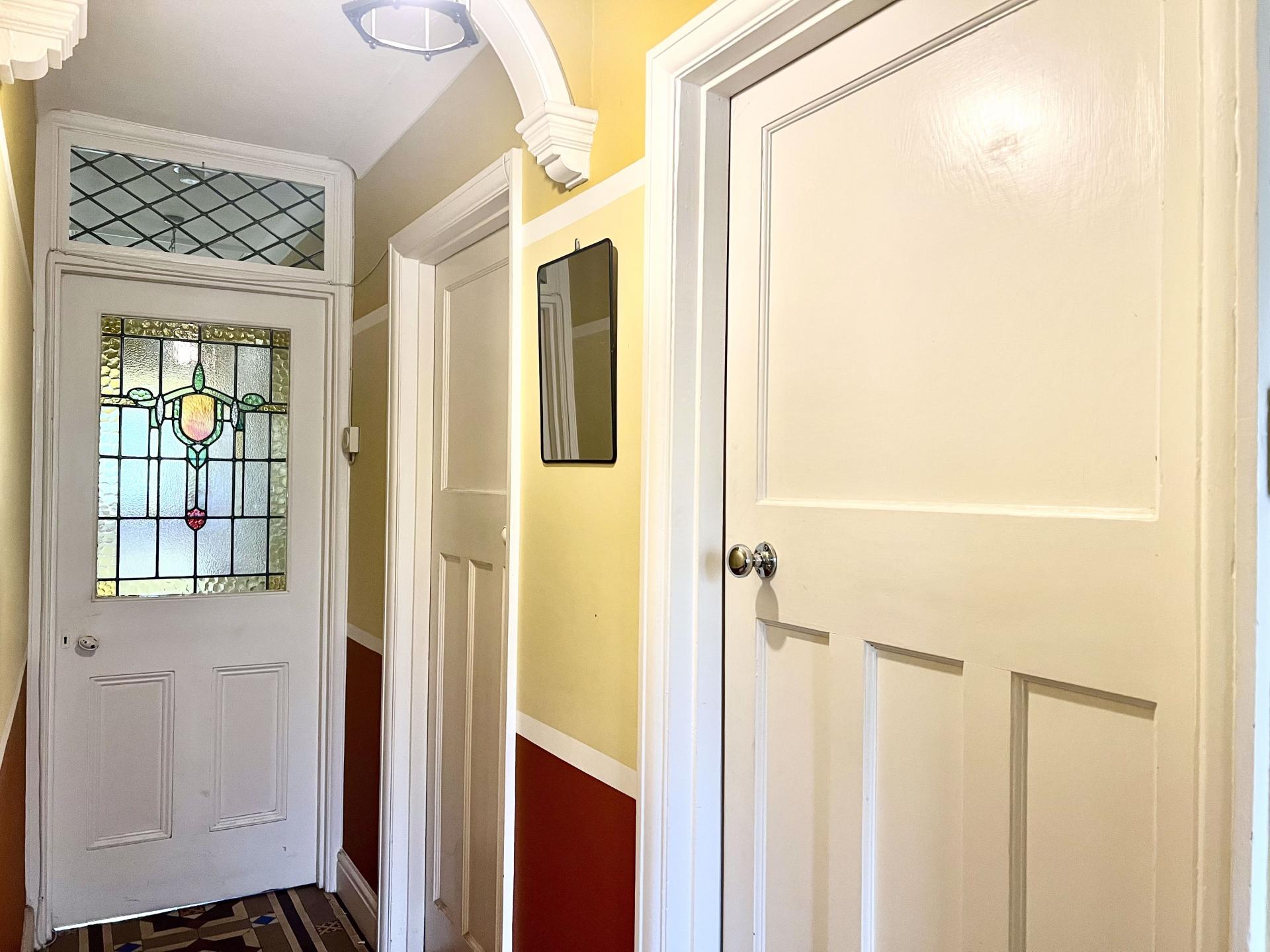 Ceiling coving, doors to bedrooms, leaded stained glass door to inner hallway, radiator, original tiled flooring.