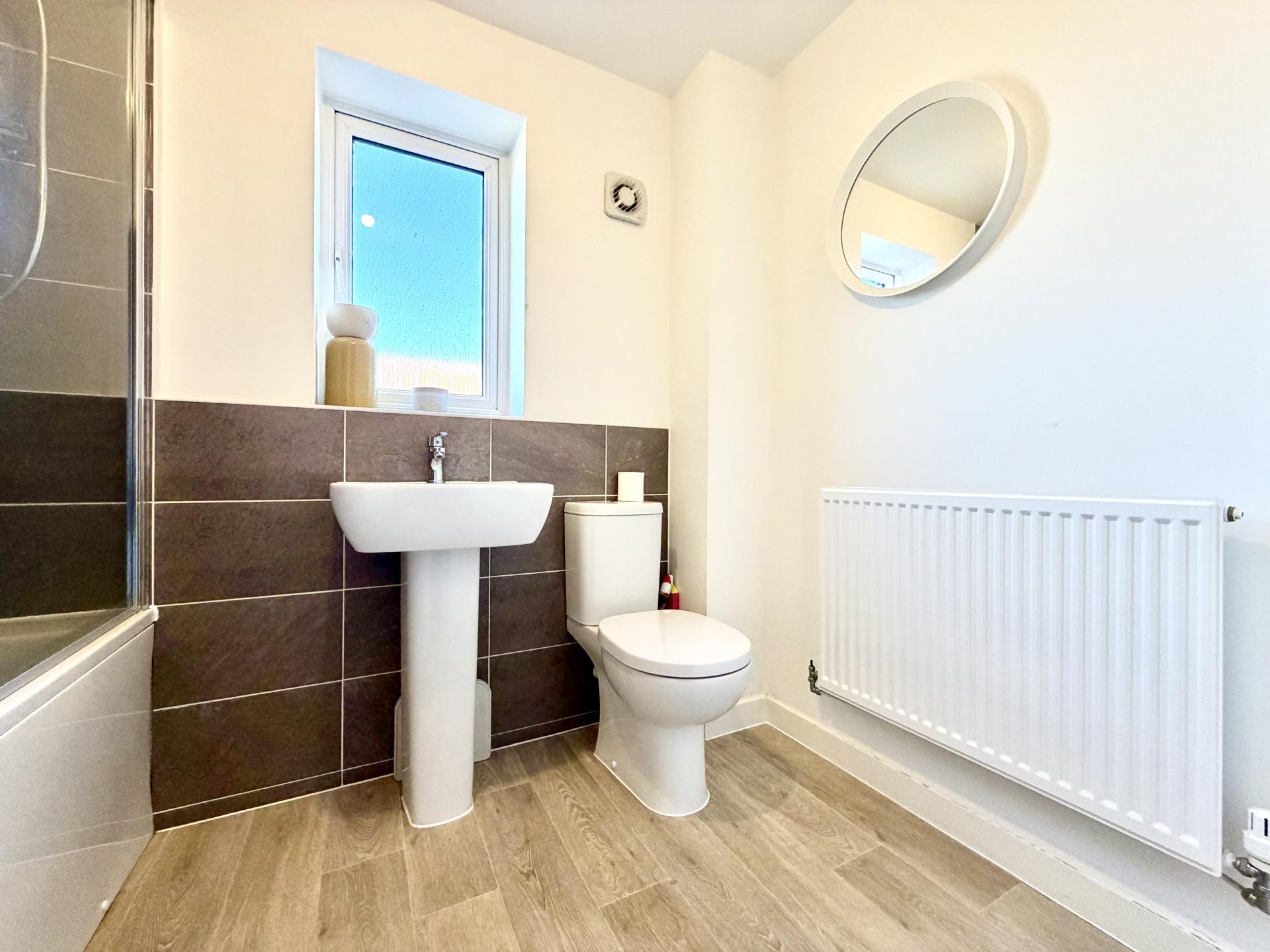 Upvc double glazed obscure window to side, modern fitted suite comprising close coupled w.c., pedestal wash hand basin, panelled bath with shower over, glass shower screen, tiled surrounds, radiator, vinyl flooring.