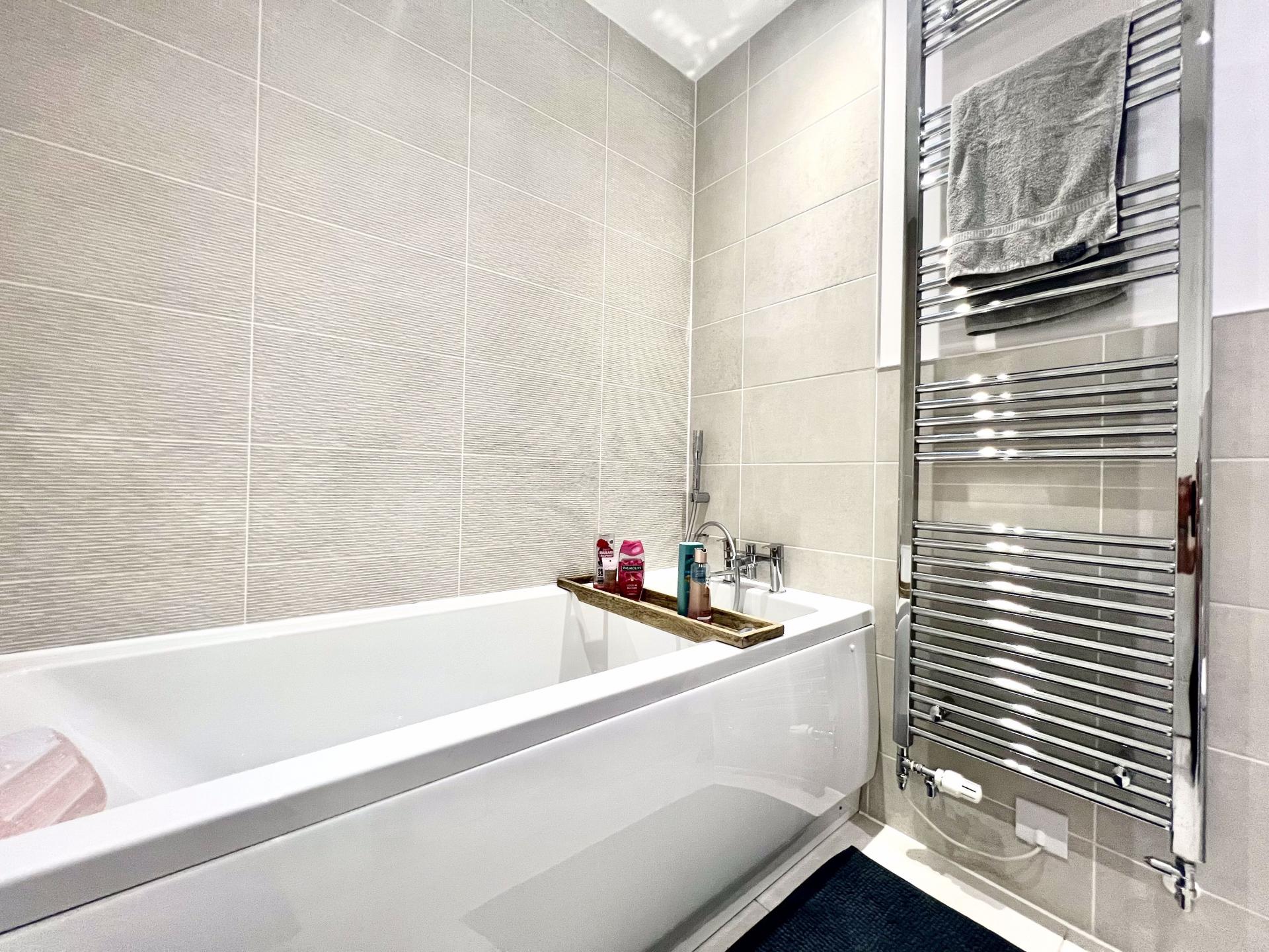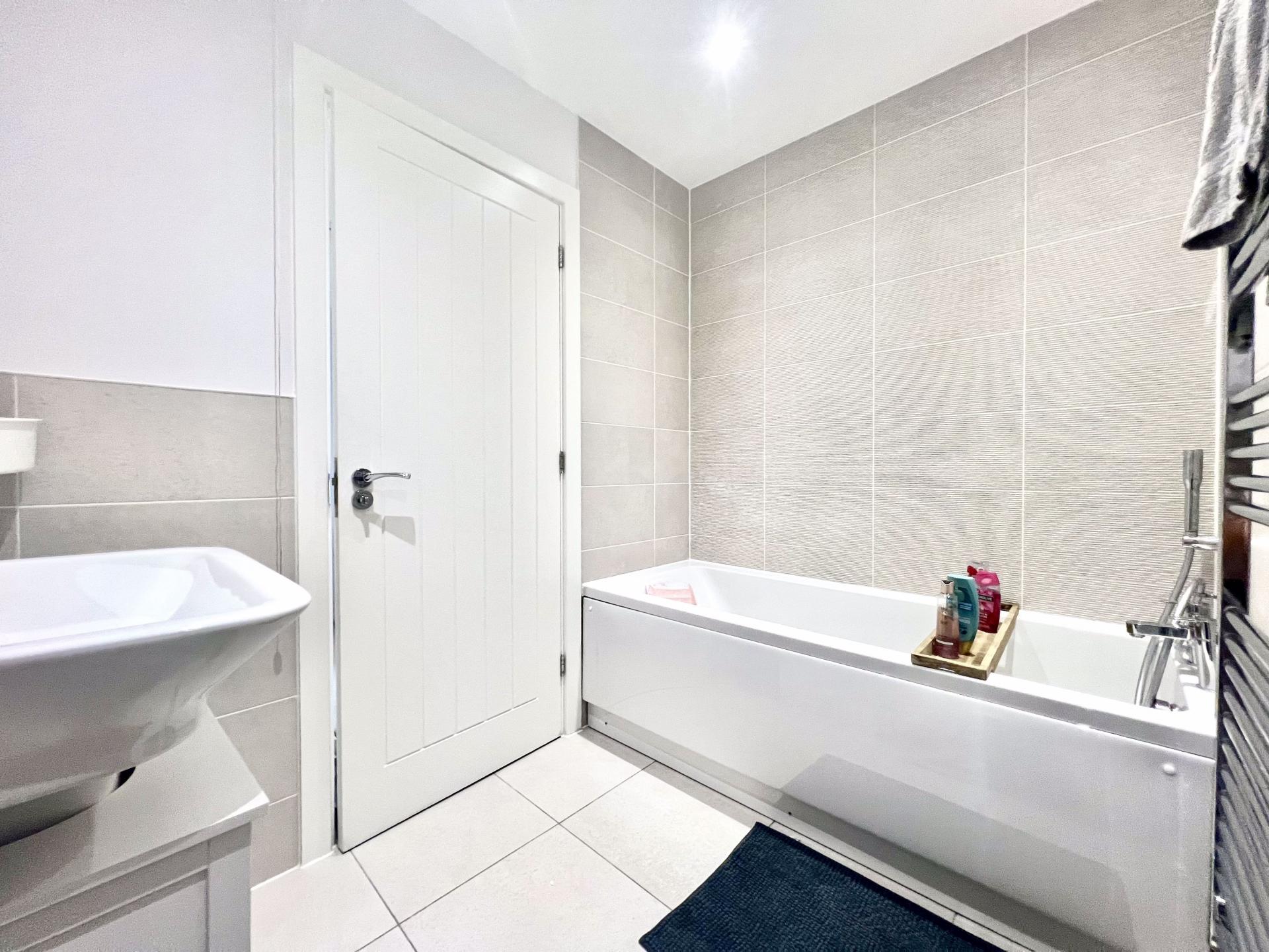 Modern fitted suite to include close coupled w.c., pedestal wash hand basin, panelled bath with mixer tap shower over, tiled surrounds, chrome ladder style radiator and tiled flooring.
