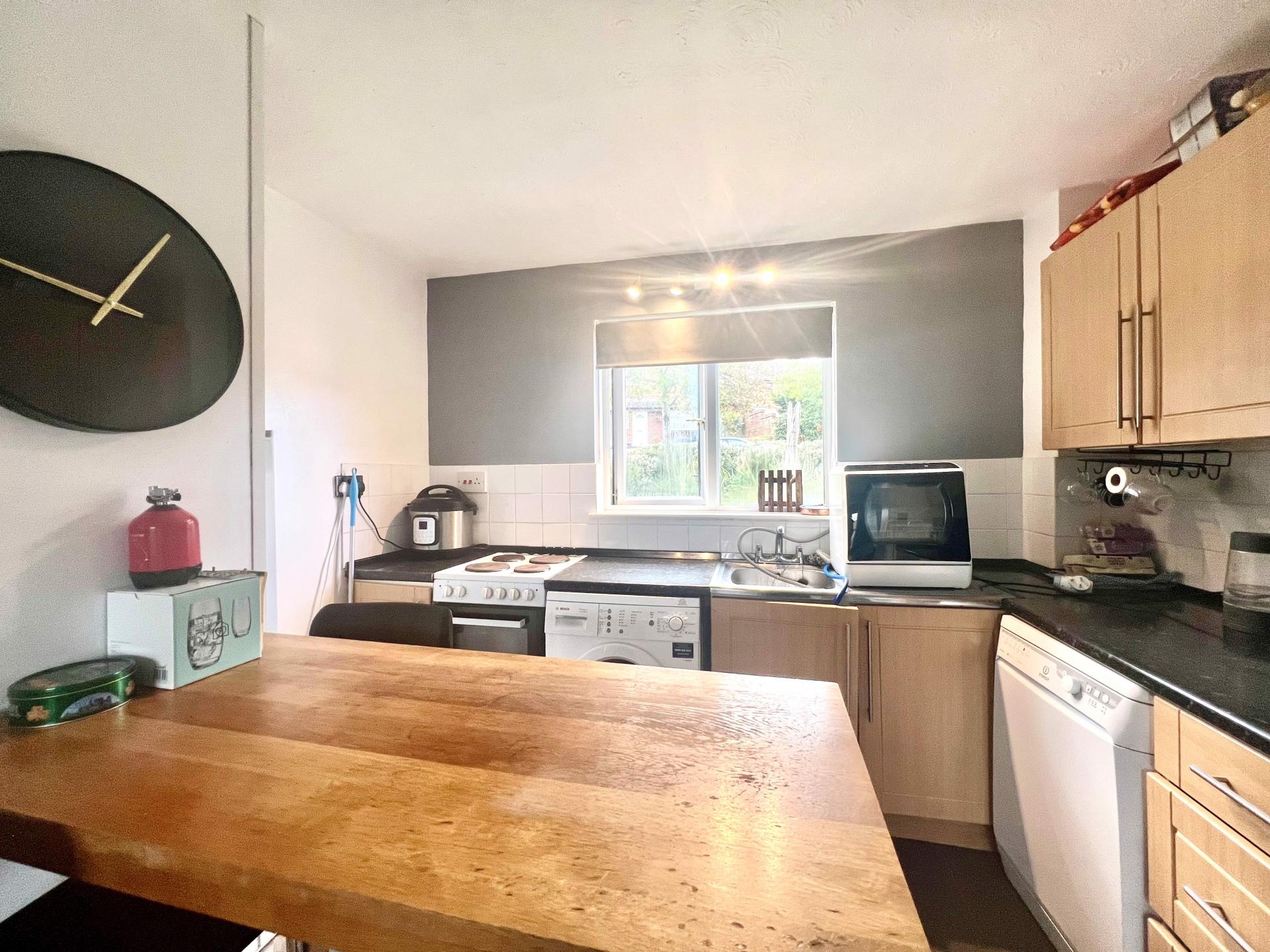 Kitchen Area includes wall and base units with work surface over, stainless steel sink unit, tiled splash backs, space for free standing electric cooker, space and plumbing for washing machine, space for fridge freezer, solid wood breakfast bar, tiled flooring in kitchen.