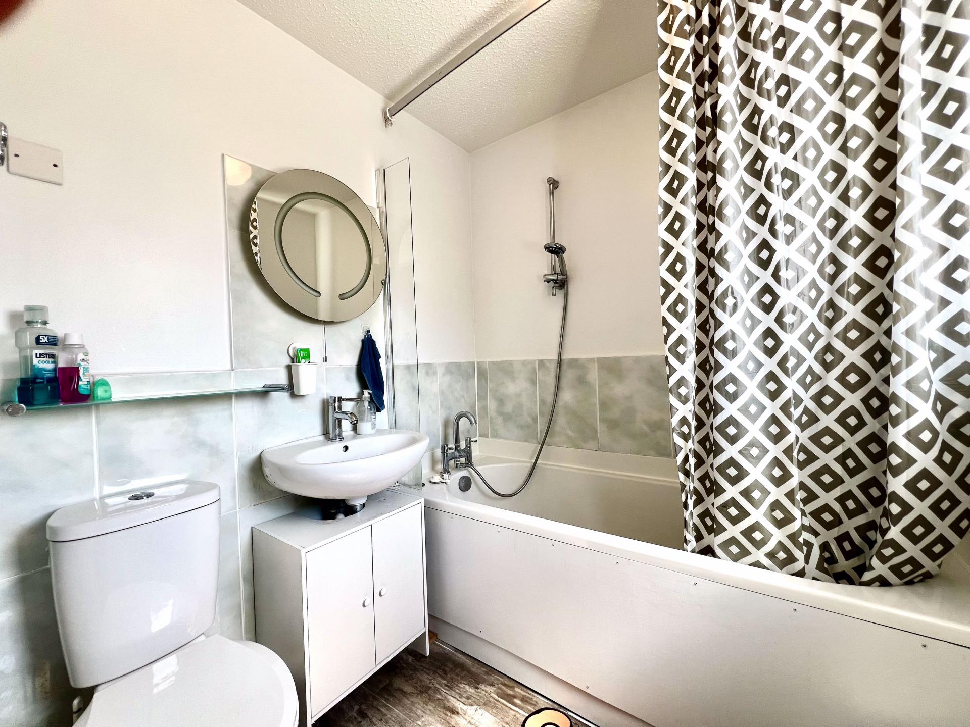 Upvc double glazed obscure window to the rear, white fitted suite to include close coupled w.c., wall mounted wash hand basin, panelled bath with mixer tap shower over, tiled surrounds, laminate flooring.