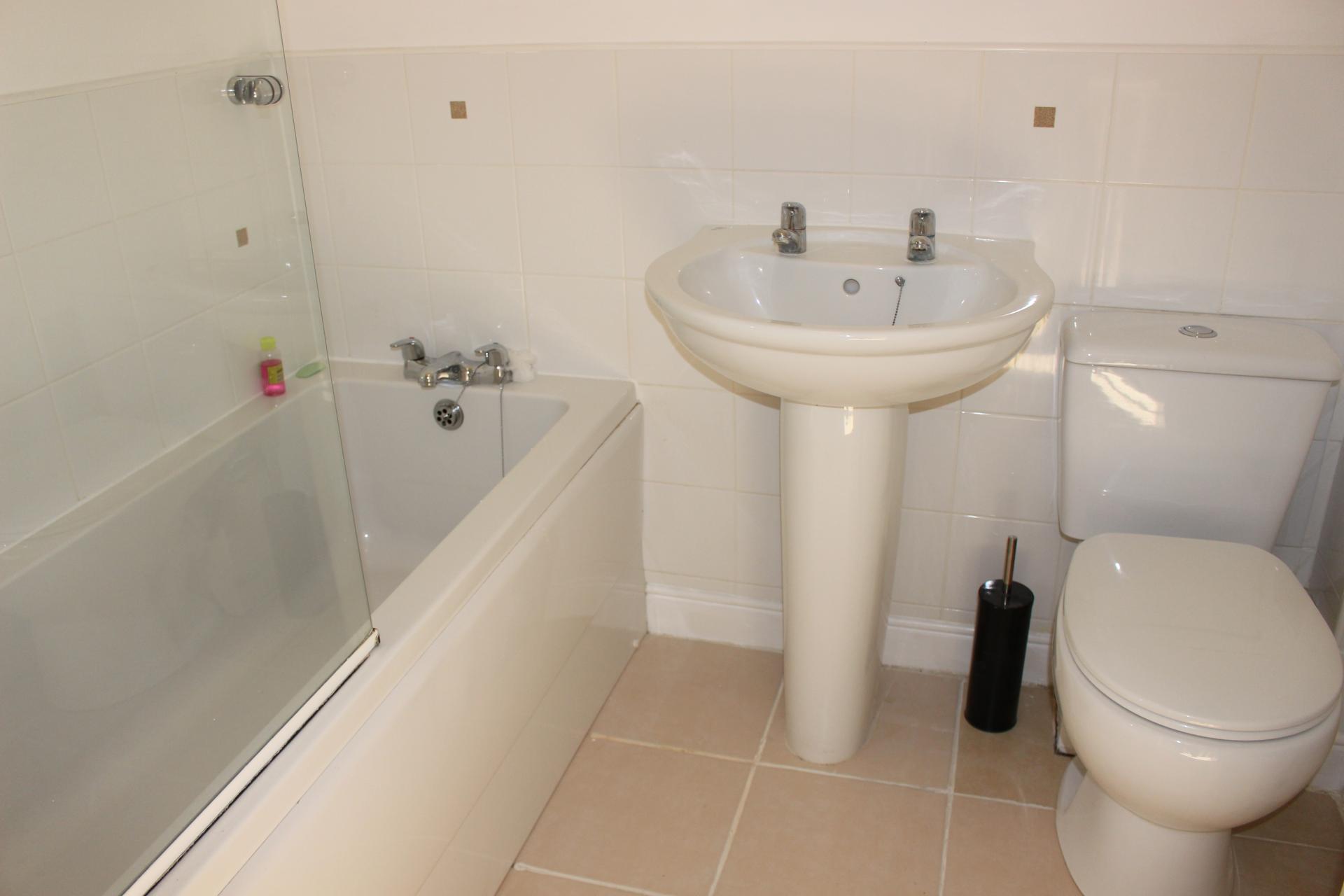 Modern fitted suite comprising close coupled w.c., pedestal wash hand basin, panelled bath with shower over, tiled surrounds, radiator, tiled flooring.
