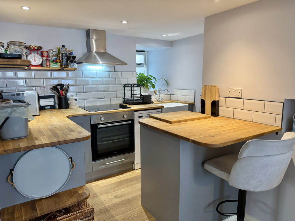 Fitted with base units under solid wood work surfaces, tiled surrounds, open shelving, inset electric hob with cooker hood over and separate oven and grill under, plumbing and space for slimline dishwasher, space for fridge, Belfast sink with mixer tap over, inset ceiling lighting, single glazed window to rear with deep sill.