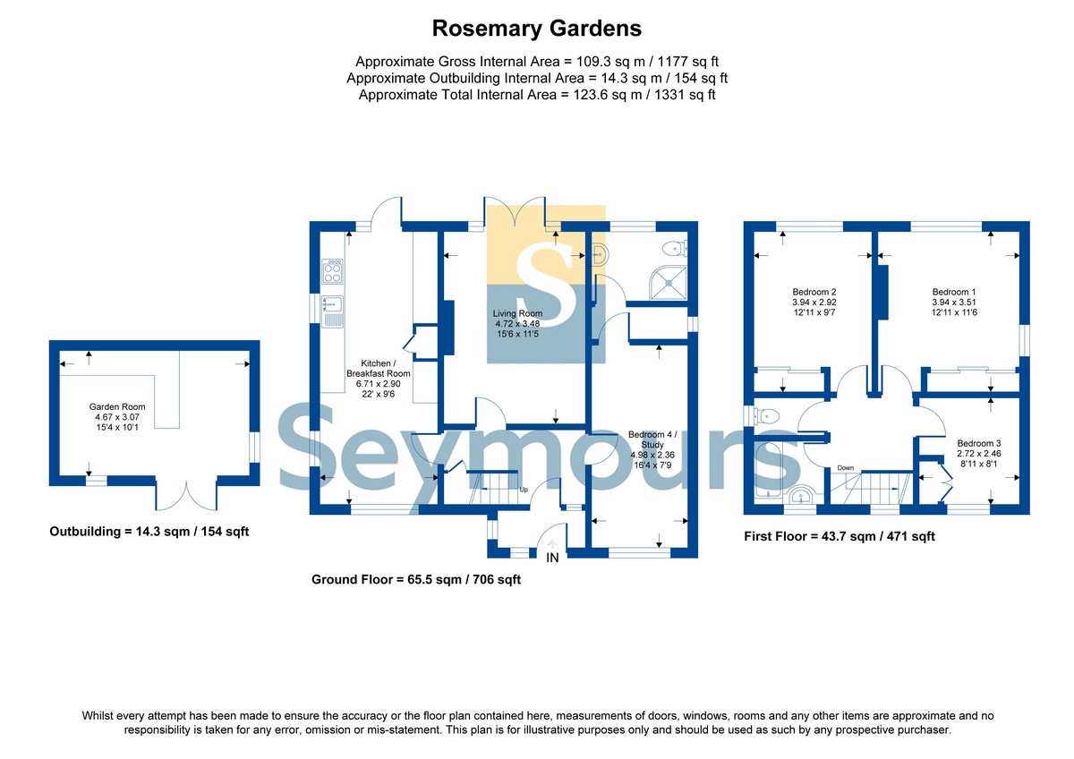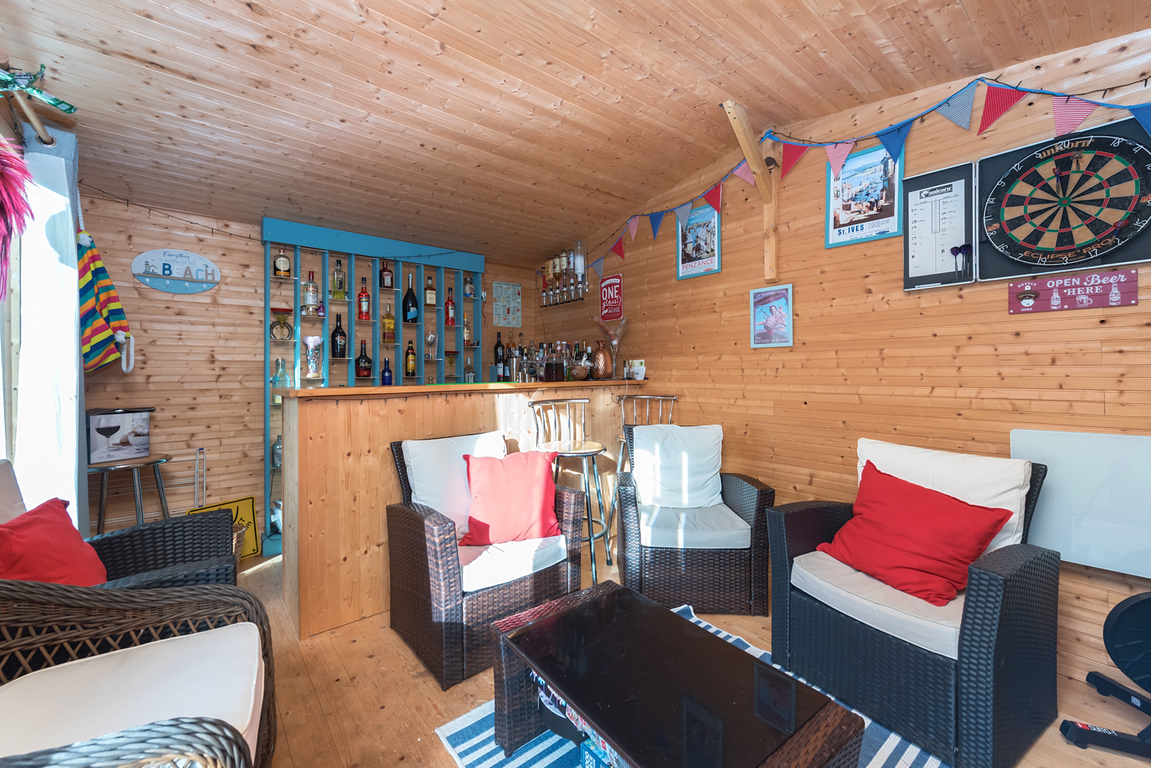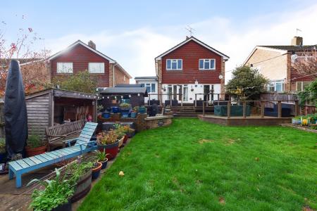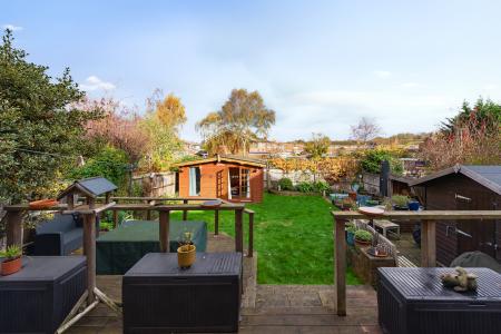 The rear garden is a standout feature, offering a large lawn, raised decked entertaining space, and mature plants. There is large outbuilding measuring approximately 154 sq ft is ideal space for a garden room, hobby space or home office. Additional storage is available via the sheltered seating area and garden shed.