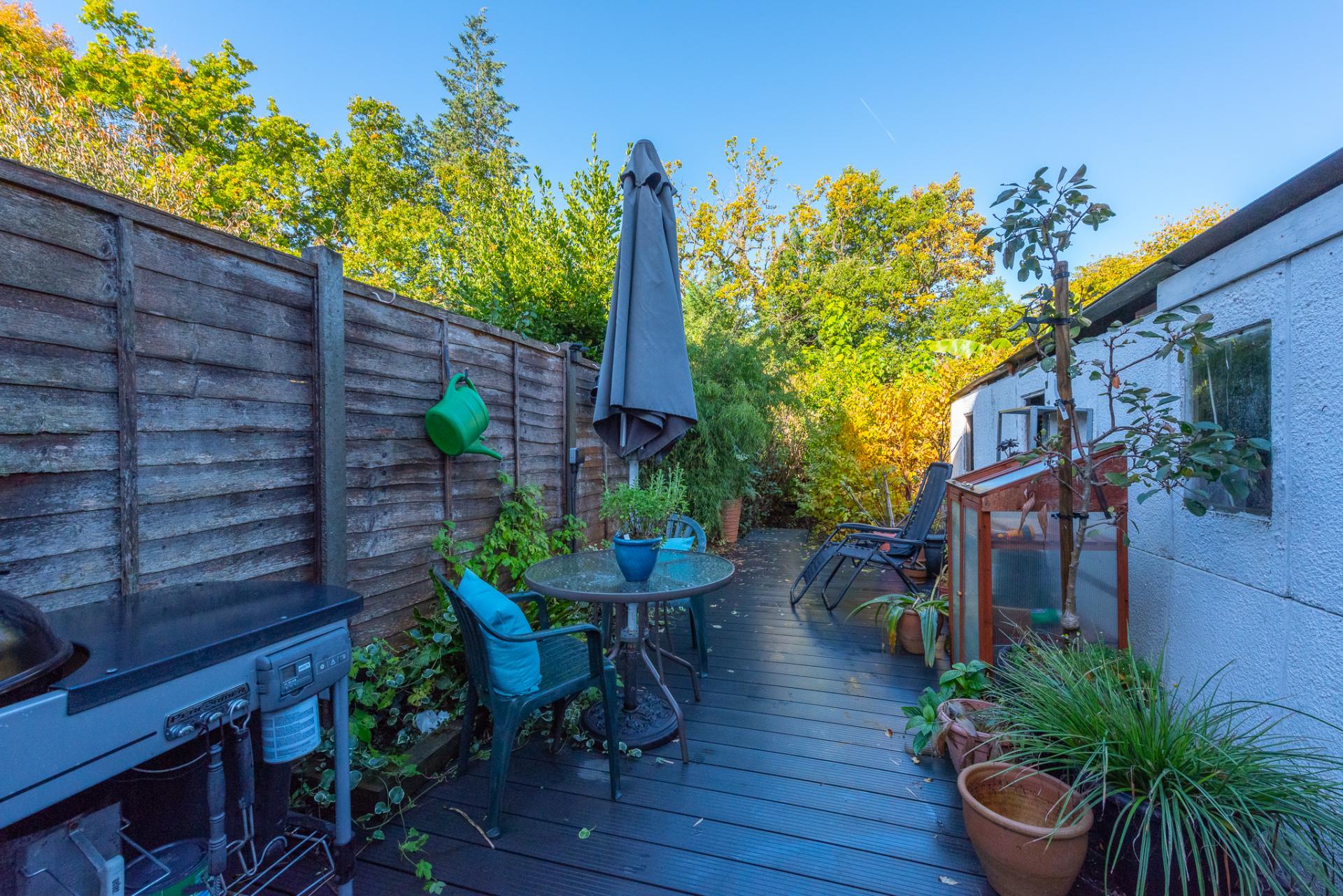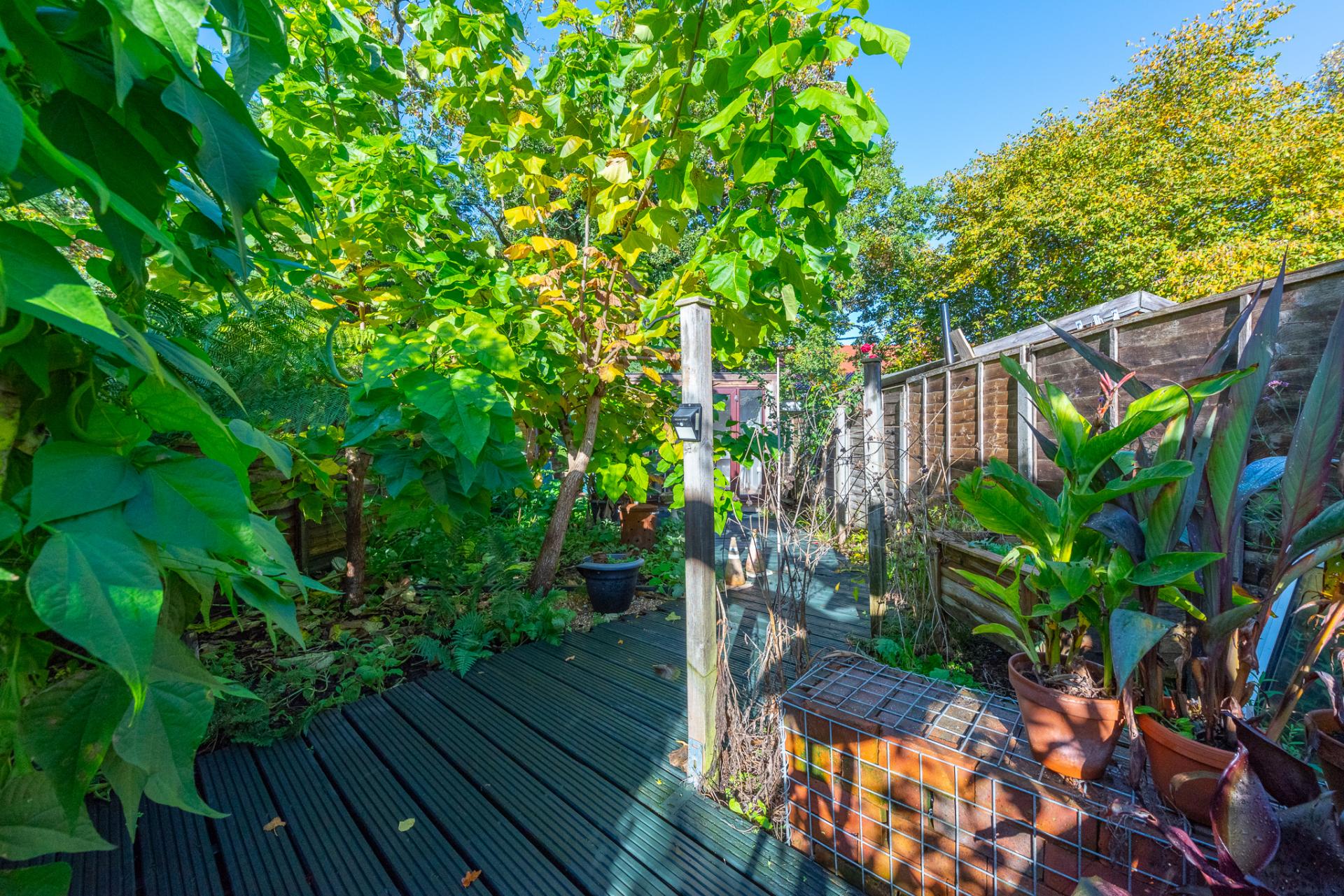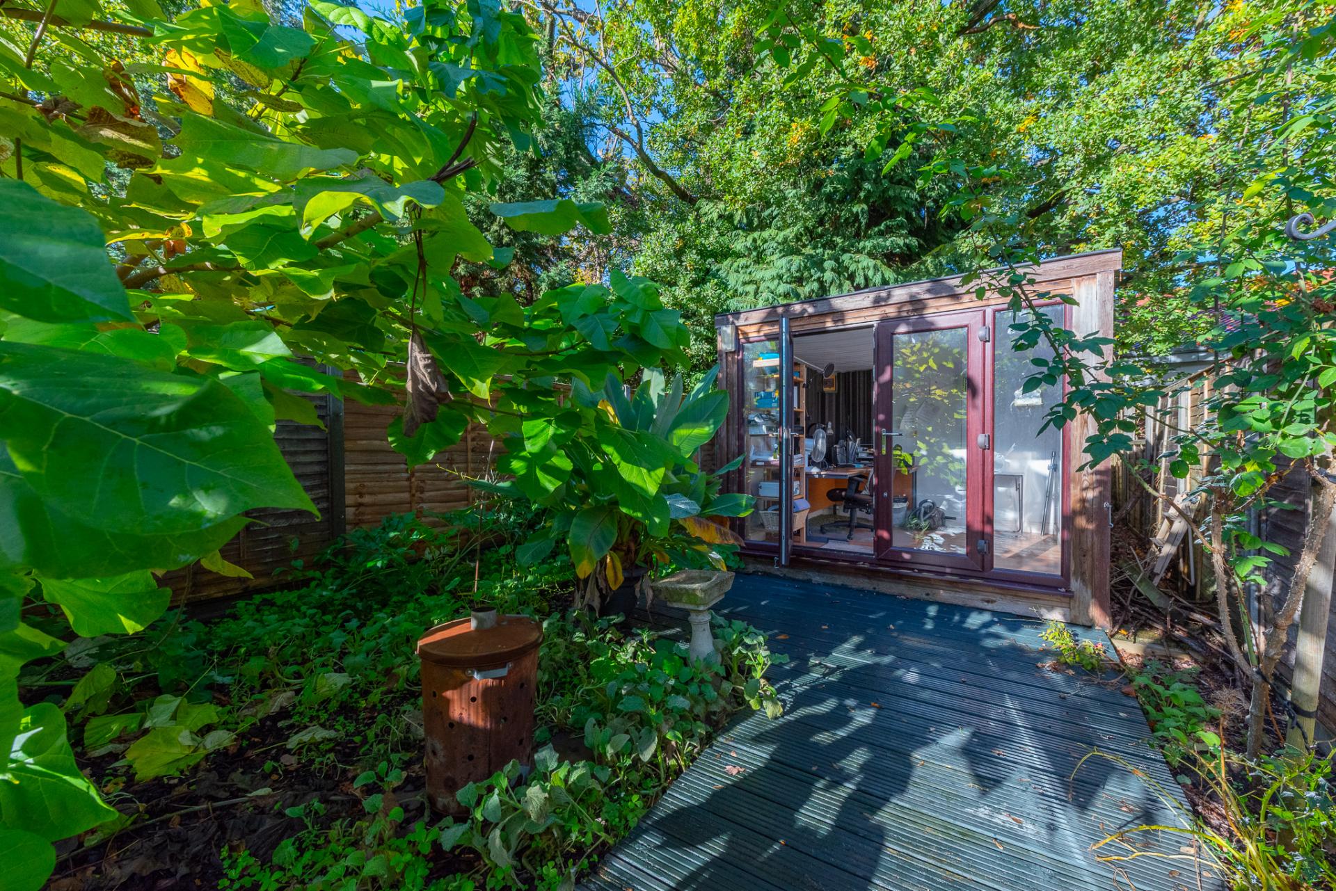 - Attractive tropical garden with large decked area and decked path leading to a garden office