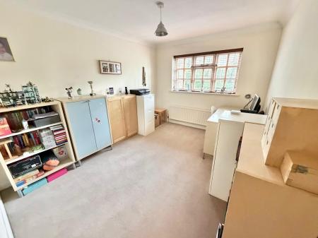 Complementing this space is a beautifully proportioned formal sitting room, featuring a striking stone fireplace and French doors leading out to the garden. Double doors connect through to the elegant front aspect dining room, which could equally serve as a stylish snug, children's playroom or home office. A fourth reception room to the front of the property is currently arranged as a home gym, though it was originally designed as a study, offering further flexibility.