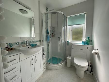 The shower room includes a matching white suite, with low-level WC and wash basin over unit storage, with a corner shower cubicle and heated towel rail.
