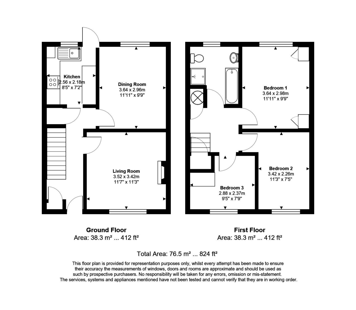 To the first floor are the three bedrooms and the family bathroom with a panel enclosed bath, separate shower cubicle and WC.