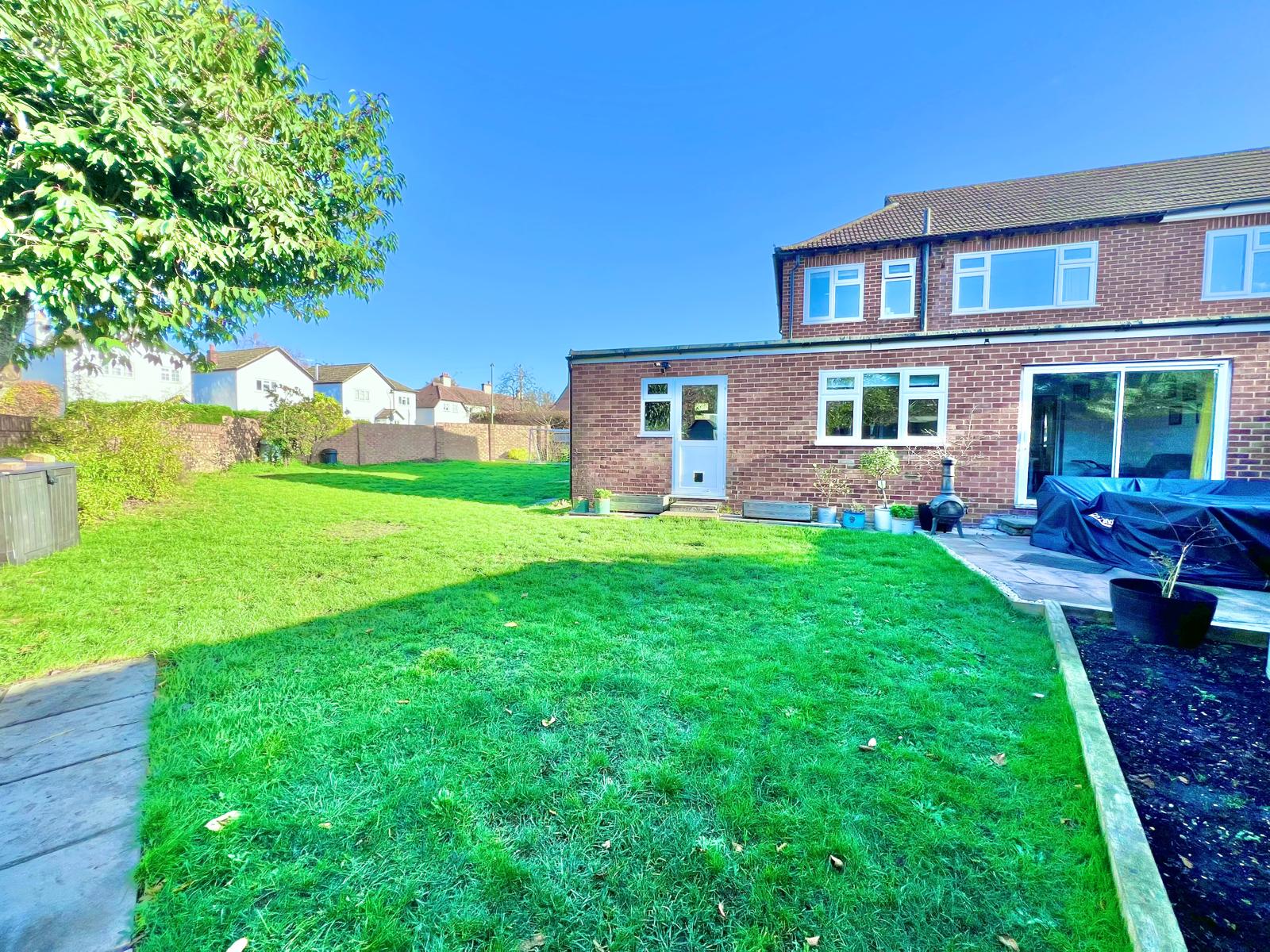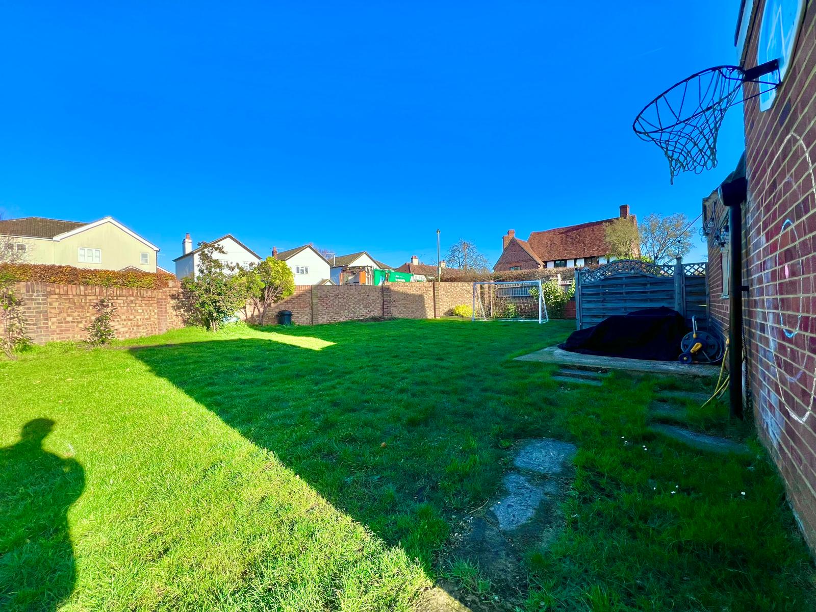 Externally, the substantial garden is enclosed by a brick wall and wraps around the property, providing access to the garage and driveway.