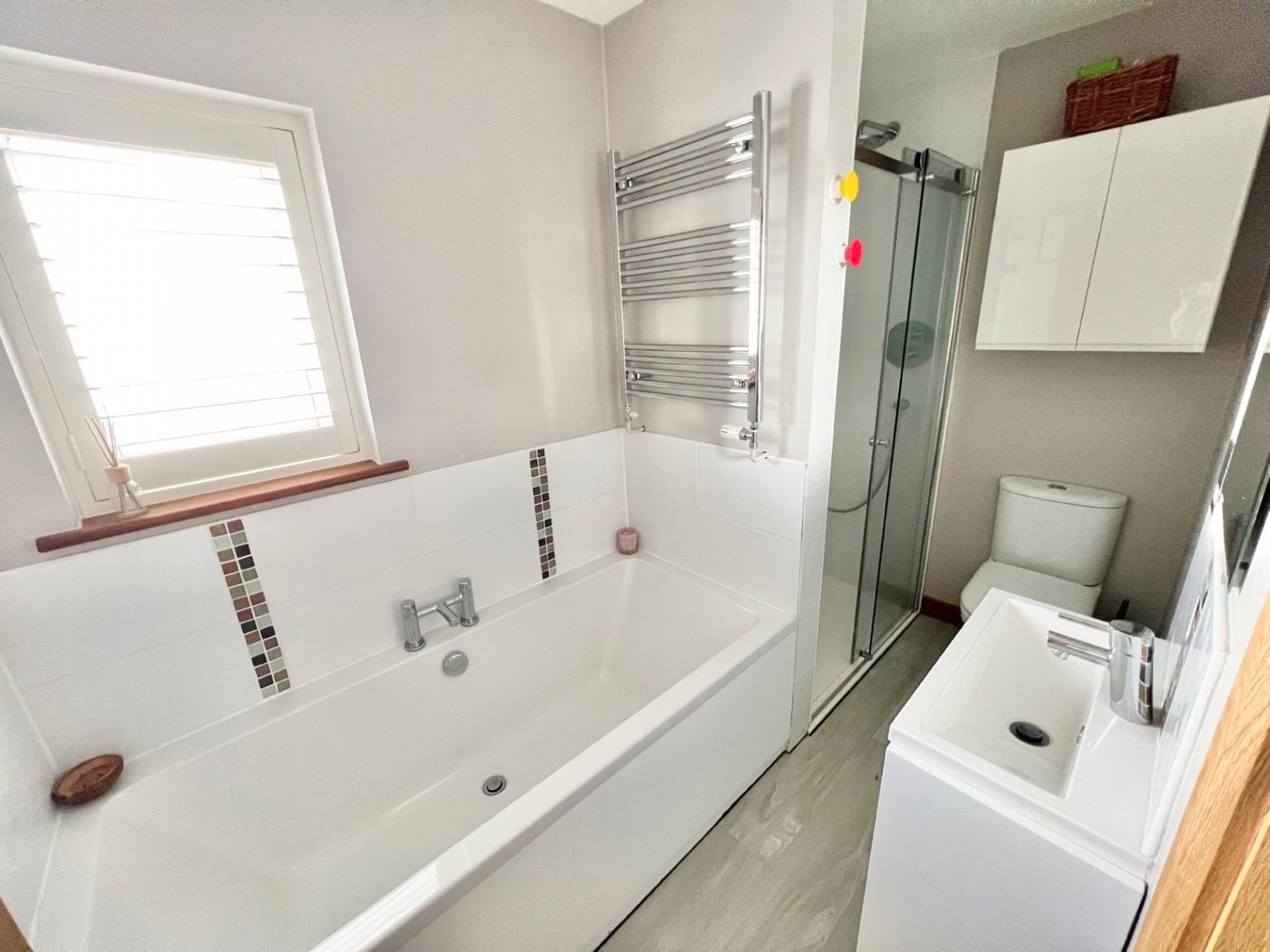 Externally there is a landscaped rear garden with a patio to the rear of the property leading to the lawn. To the rear of the garden is an 'L' shaped cabin with light and power making this an ideal games room or garden bar. To the front of the property is a driveway proving off street parking leading to the garage which has a roller door to the front and back.