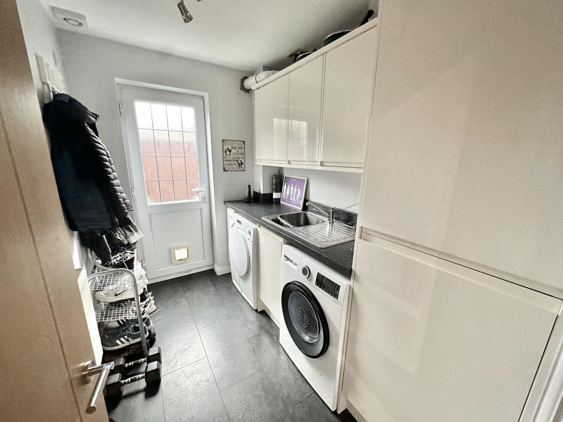 The impressive ground floor centres around a breathtaking open-plan kitchen, dining, and living space, featuring two sets of bi-folding doors that open onto the rear garden-creating an exceptional setting for both everyday family life and entertaining. The modern kitchen offers a comprehensive range of eye and base level units, a substantial breakfast bar, and integrated appliances including a fridge, freezer, washing machine, and two ovens. There is also a separate utility room providing additional space and plumbing for a washing machine and tumble dryer. To the front of the property are two further reception rooms, currently arranged as a playroom and home office, offering excellent flexibility.