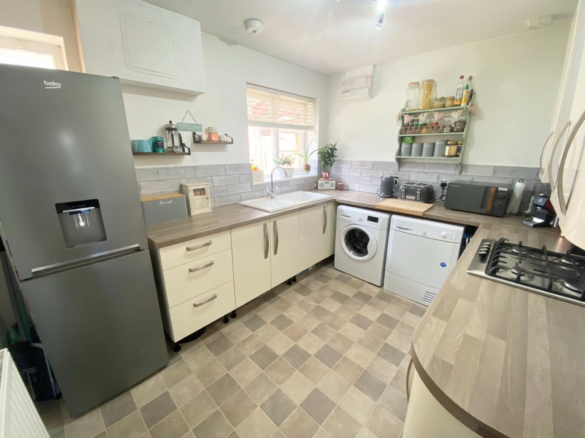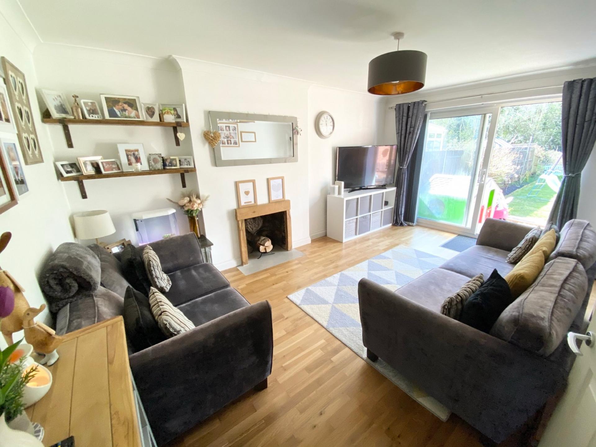 The accommodation comprises a rear aspect living room with a feature fireplace and sliding doors leading out to the south facing rear garden, a refitted kitchen with a matching range of eye and low level units with an integrated oven with a four ring gas hob above, as well as space and plumbing for a washing machine, tumble dryer and fridge/freezer. To the front of the property are the two double bedrooms.