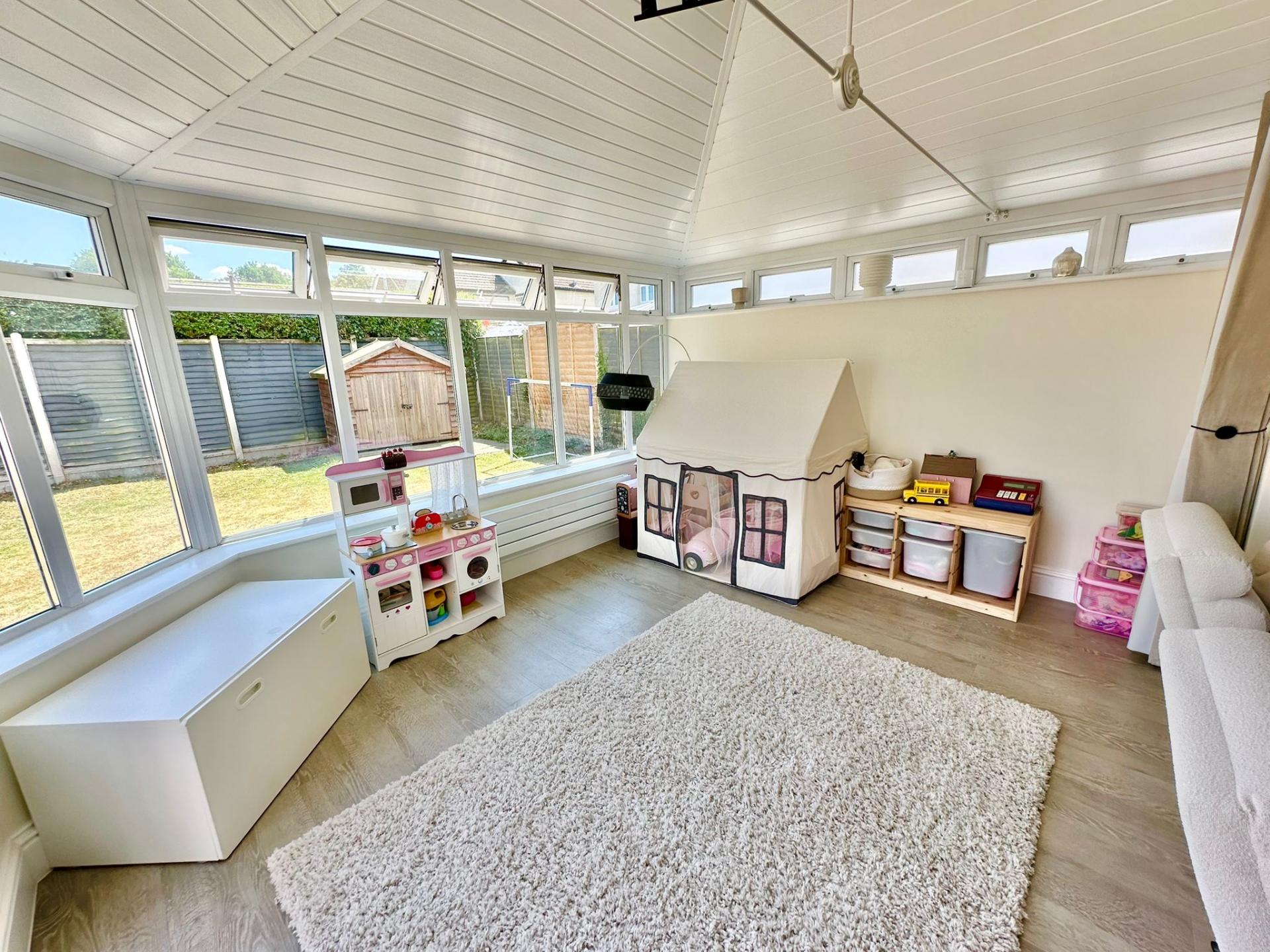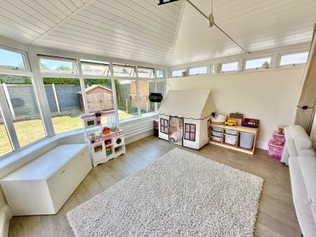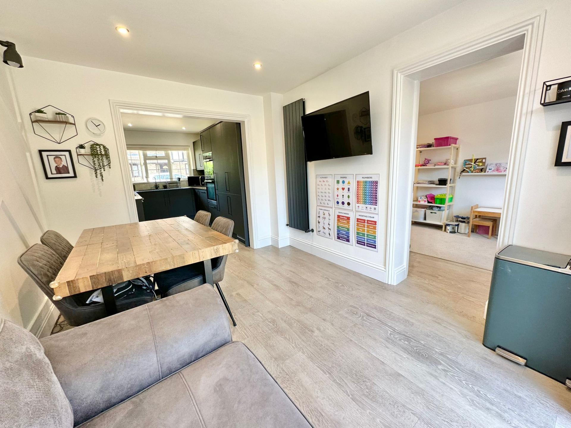 The spacious ground floor accommodation comprises a modern living room with a range of bespoke storage with recessed lighting and space for a wall-mounted TV. The living room leads through to the rear aspect dining room with French Doors leading out to the rear garden. There is also a double aspect kitchen breakfast room with doors leading out to the rear garden, a door through to the play room, space for a dining table and a matching range of eye and low-level units and integrated appliances including fridge, freezer, waist height oven with separate grill, four ring gas hob and a dishwasher. To the front of the property is a study/office with double glazed windows overlooking the front garden.