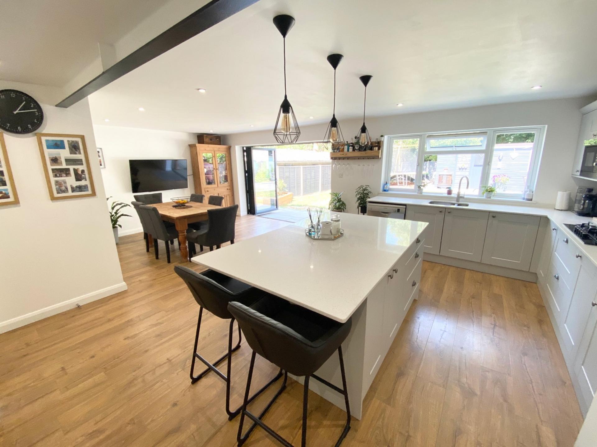 The larger than expect accommodation comprises a beautiful open plan kitchen/dining space to the rear of the property with bi-folding doors leading to the rear garden and a refitted kitchen with a matching range of eye and low level units, substantial island offering further storage below, stone work surfaces and integrated appliances including waist height double oven, microwave and a five ring gas hob. There is also space and plumbing for an American Fridge Freezer and dishwasher. The kitchen also benefits from a separate utility room with a door leading to the side of the property. To the front of the property is the double aspect sitting room with. The master suite is boasts a walk through dressing room leading to the refitted en suite bath room with a panel enclosed bath with wall mounted shower above, WC and washbasin with vanity unit under.