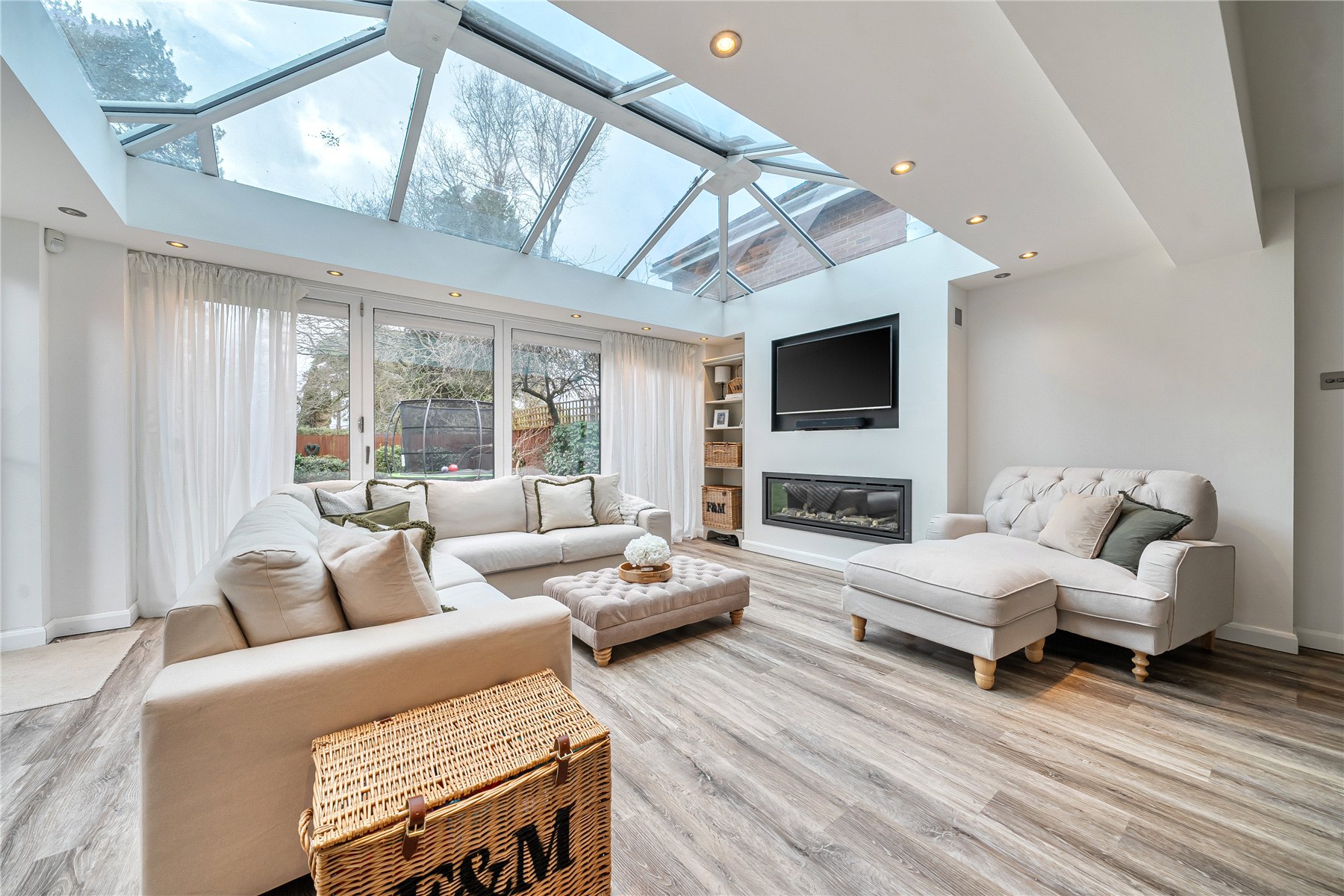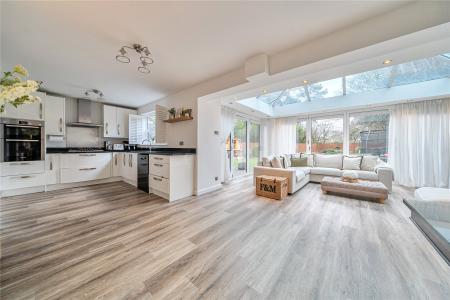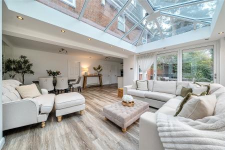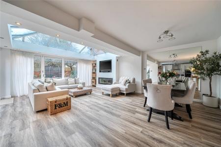 The centrepiece of the property is the magnificent open-plan kitchen/dining/family space extending beyond 27ft, a truly impressive setting for entertaining and everyday living alike. The kitchen is fitted with sleek cabinetry, high-quality integrated appliances and expansive work surfaces, perfectly balanced by a light-filled family area. A striking roof lantern bathes the room in natural light, while bi-fold doors span the rear elevation, creating a seamless transition to the garden and delivering an enviable indoor-outdoor lifestyle.