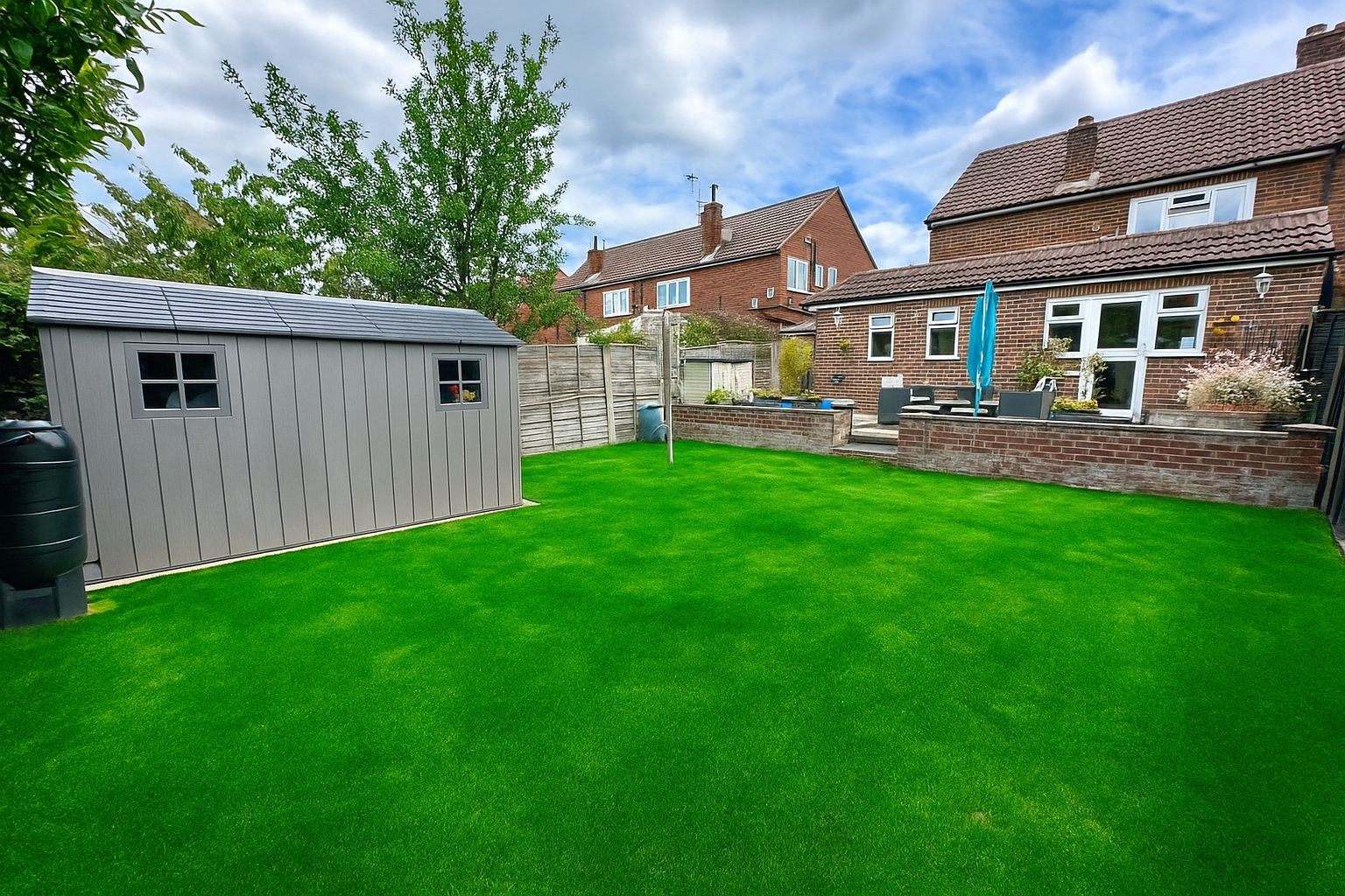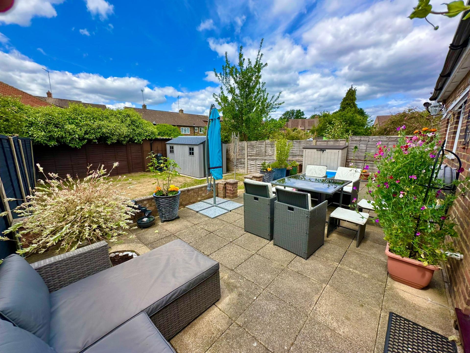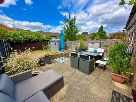 The enclosed rear garden is again generous, with its paved patio and lawned area. The property benefits from a double access garage too – this has an up-and-over door to the front and can be accessed at the back also.