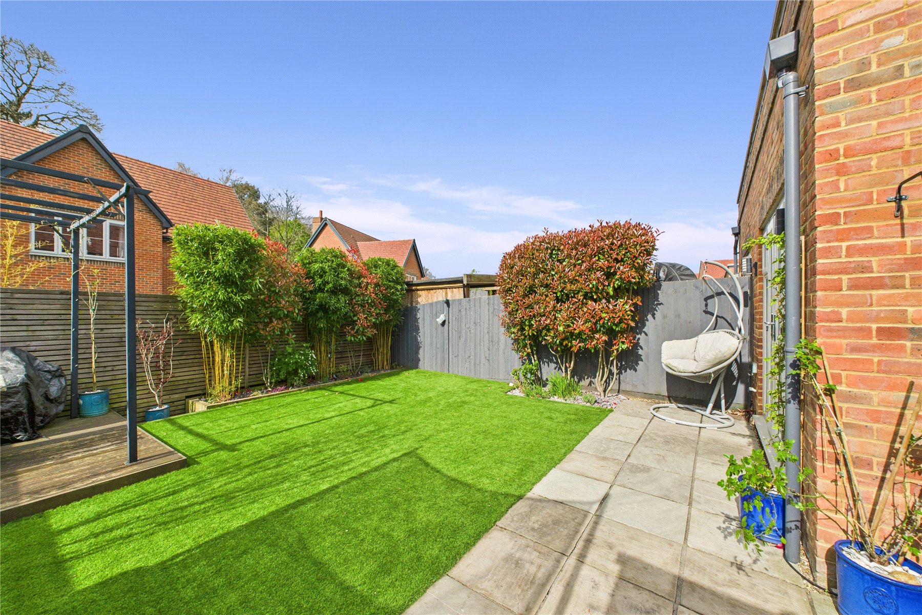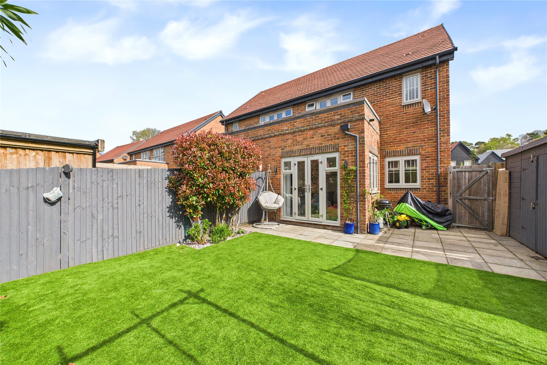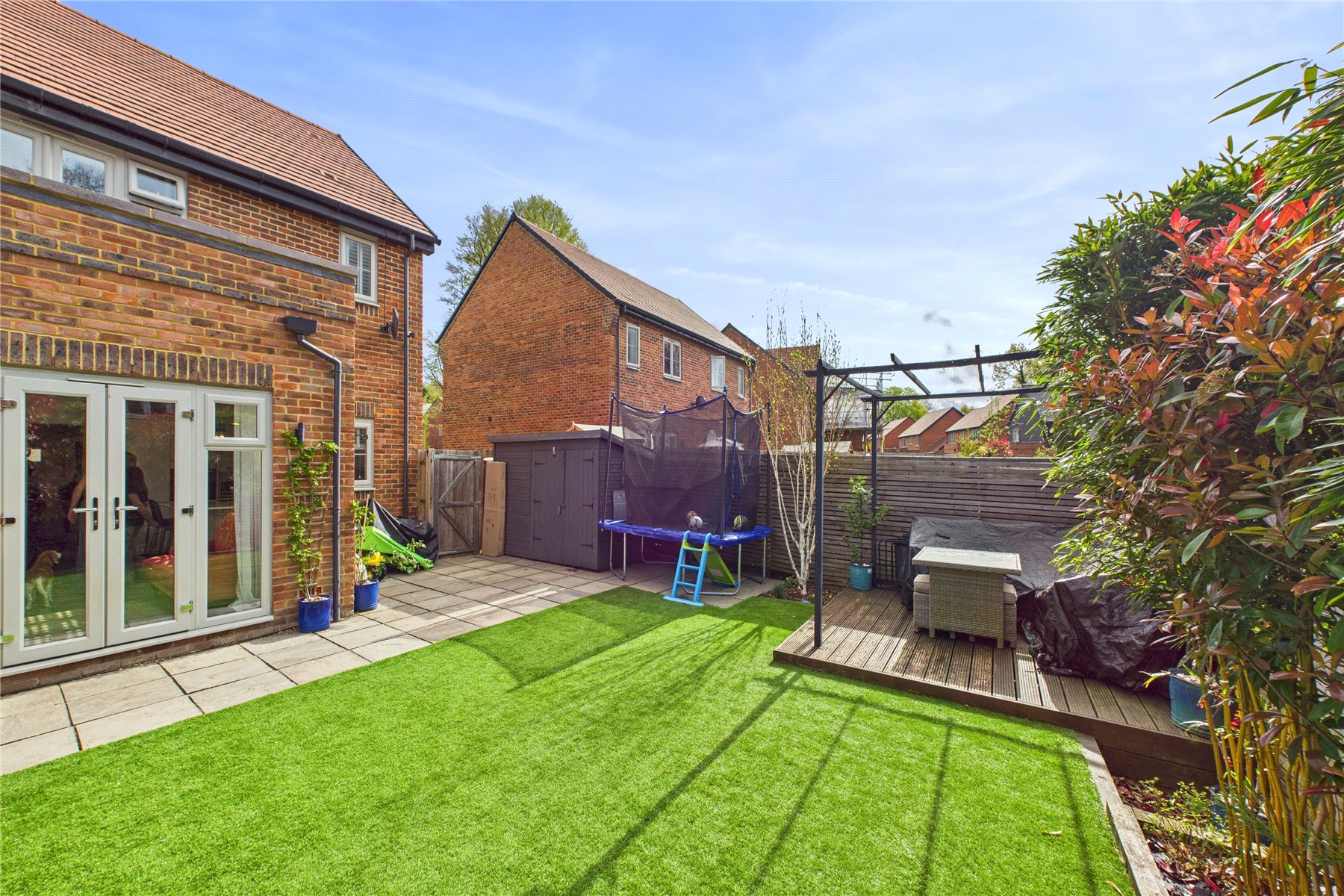To the rear, the enclosed garden features an extended patio, which leads to an artificial grass lawn. There is a garden shed, and decking with pergola.