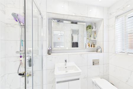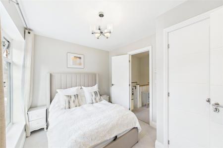 Upstairs, the property comprises two double bedrooms and a third single room. The master bedroom includes a Juliet balcony, built-in wardrobes, and a generously sized en-suite bathroom. The landing also provides access to the modern bathroom suite, airing cupboard, and loft storage.