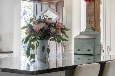 At the heart of the home lies a beautifully appointed kitchen/breakfast room, thoughtfully designed with bespoke cabinetry, stone flooring and generous work surfaces. This space seamlessly connects to the adjoining dining room, creating an ideal setting for both family living and hosting guests, while enjoying views across the gardens. A separate utility room and additional ancillary spaces provide practicality without compromising the character of the home.