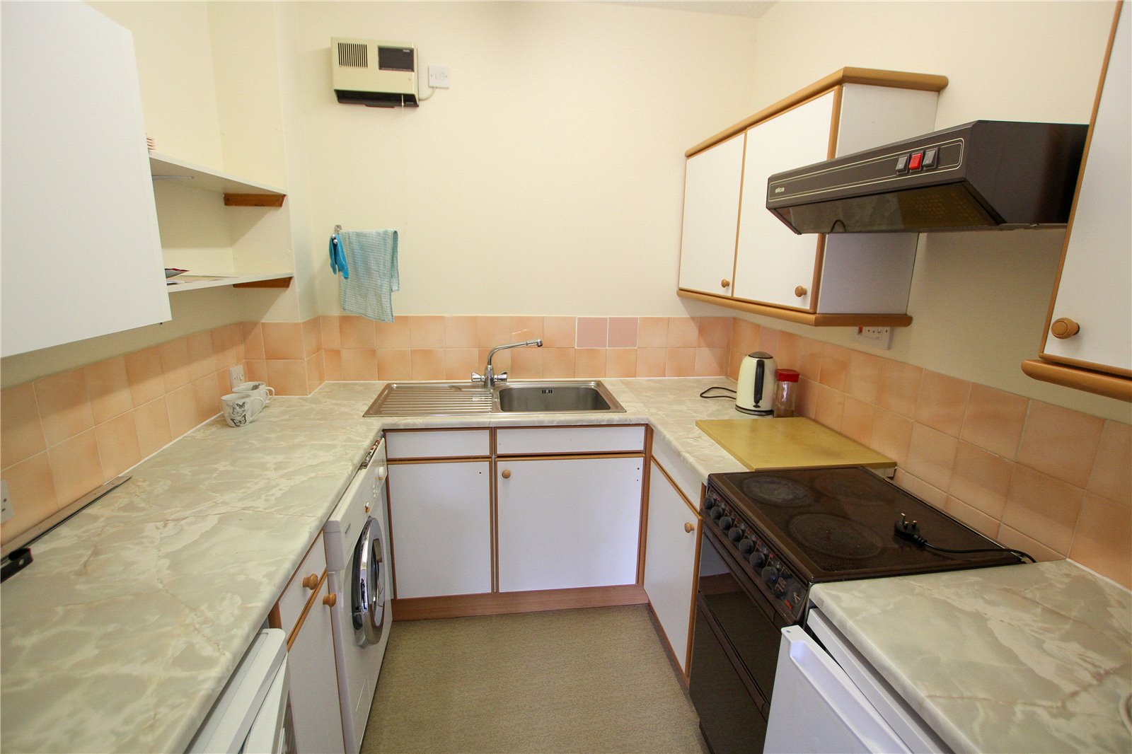 - Kitchen with oven, extractor fan, fridge, freezer and washing machine.
