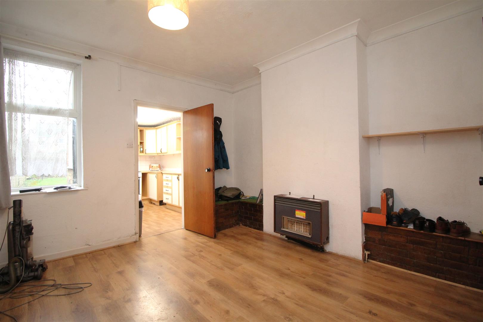 The accommodation comprises a front-facing living room leading through to a separate dining room, both laid with laminate flooring. From the dining room there is an understairs storage cupboard providing useful storage space. Also off the dining room is a fitted kitchen, offering space for appliances and a door opening out to the rear garden.
