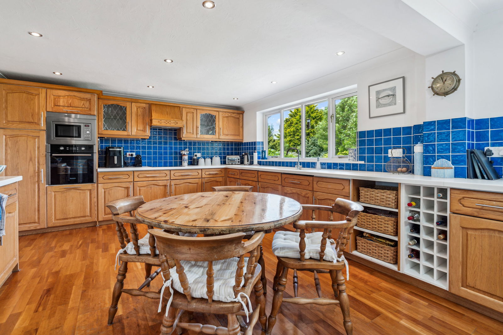 A fully fitted kitchen with an excellent range of wall and base cupboards with drawers and worktops over, integral eye level oven with microwave above, 4 ring induction hob with extractor fan over, integral dishwasher, one and a half bowl sink with mixer tap over, fitted wine rack, 2 radiators, 2 double glazed windows enjoying great views over the garden and countryside beyond.