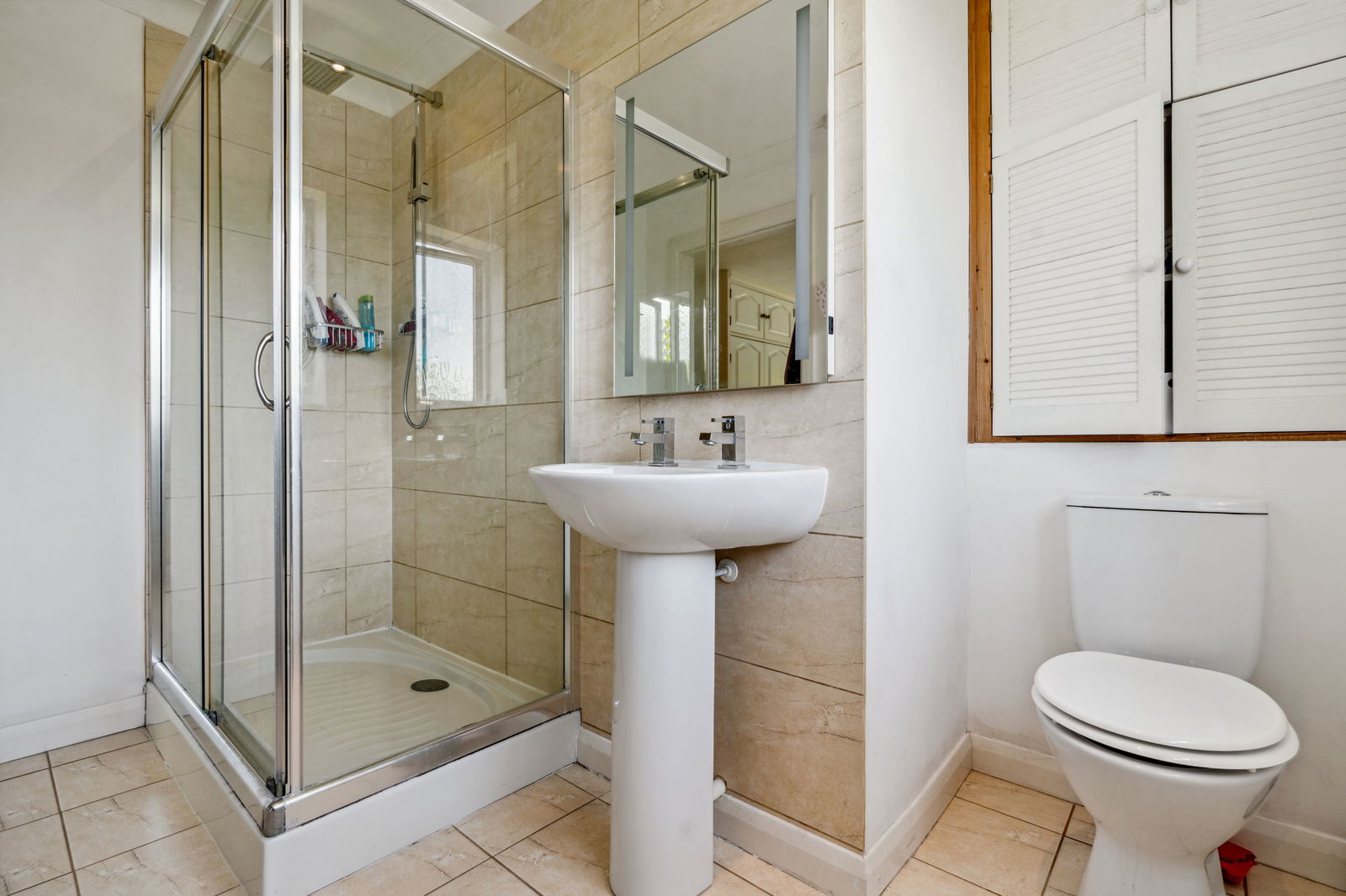 Part tiled with double shower cubicle with rainfall shower head over, low level W.C., wash hand basin, heated towel rail, built-in storage cupboard, opaque double glazed window to side.