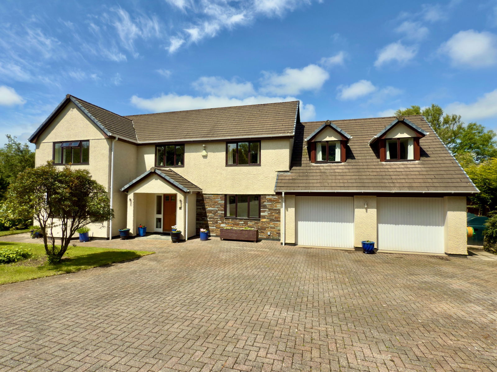 At the front a spacious brick paved driveway provides ample parking leading to double garage and entrance door.