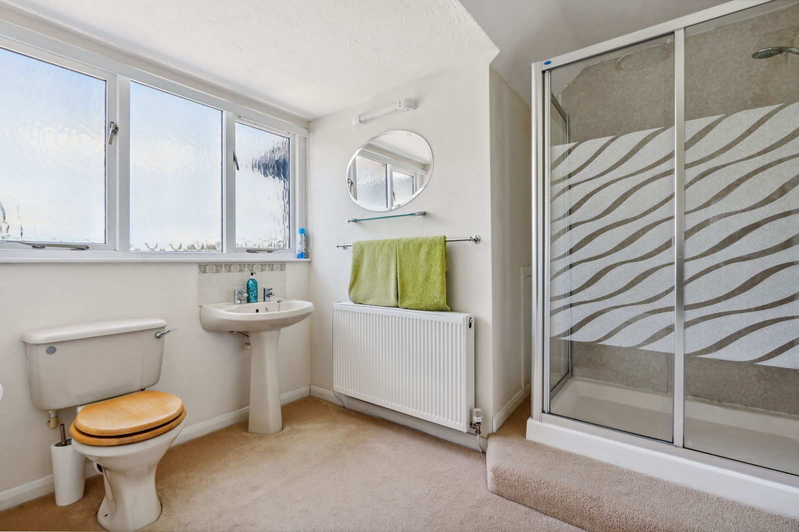 Corner bath with separate double shower cubicle, low level W.C., wash hand basin, radiator, opaque double glazed window to rear.