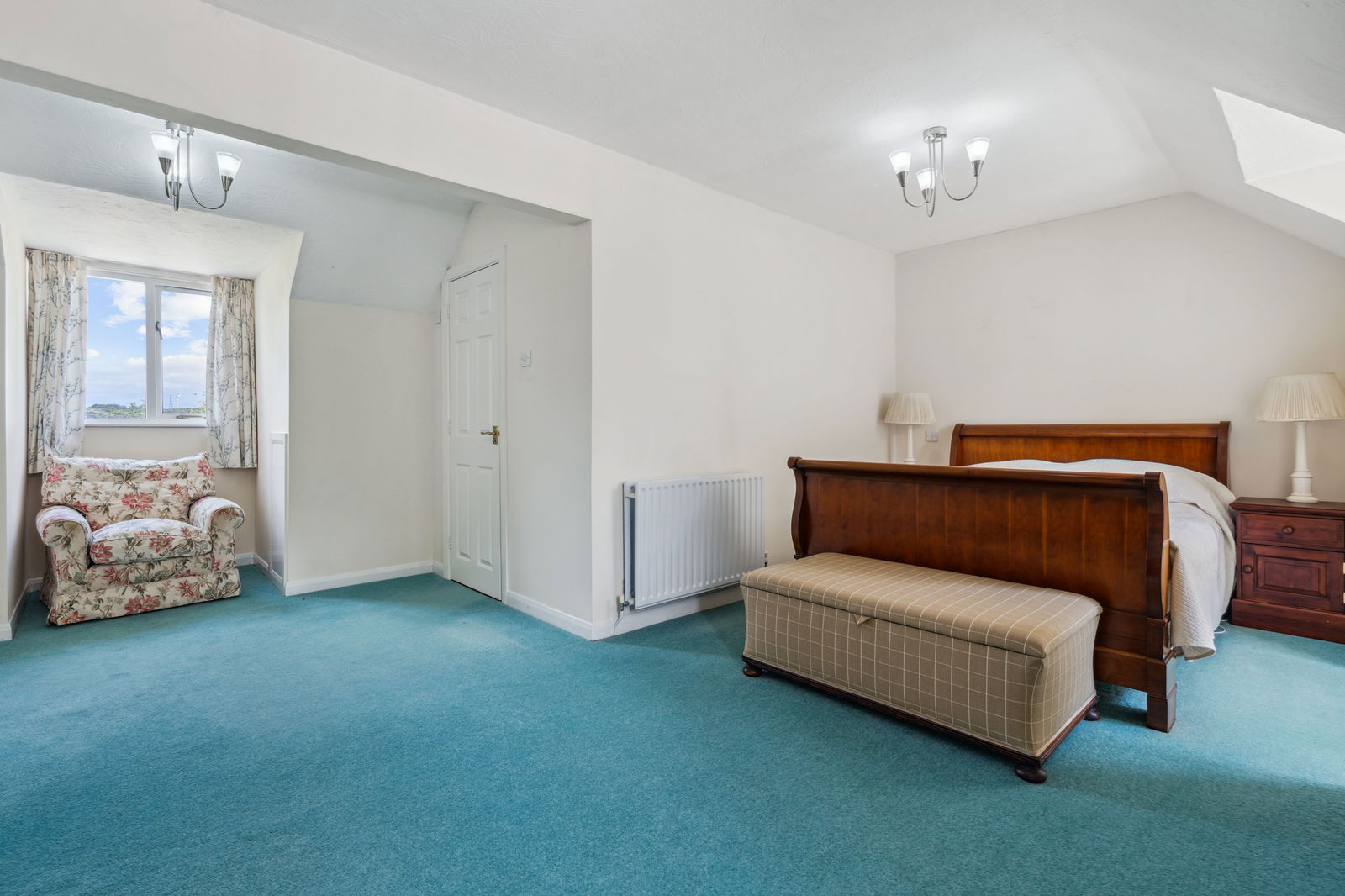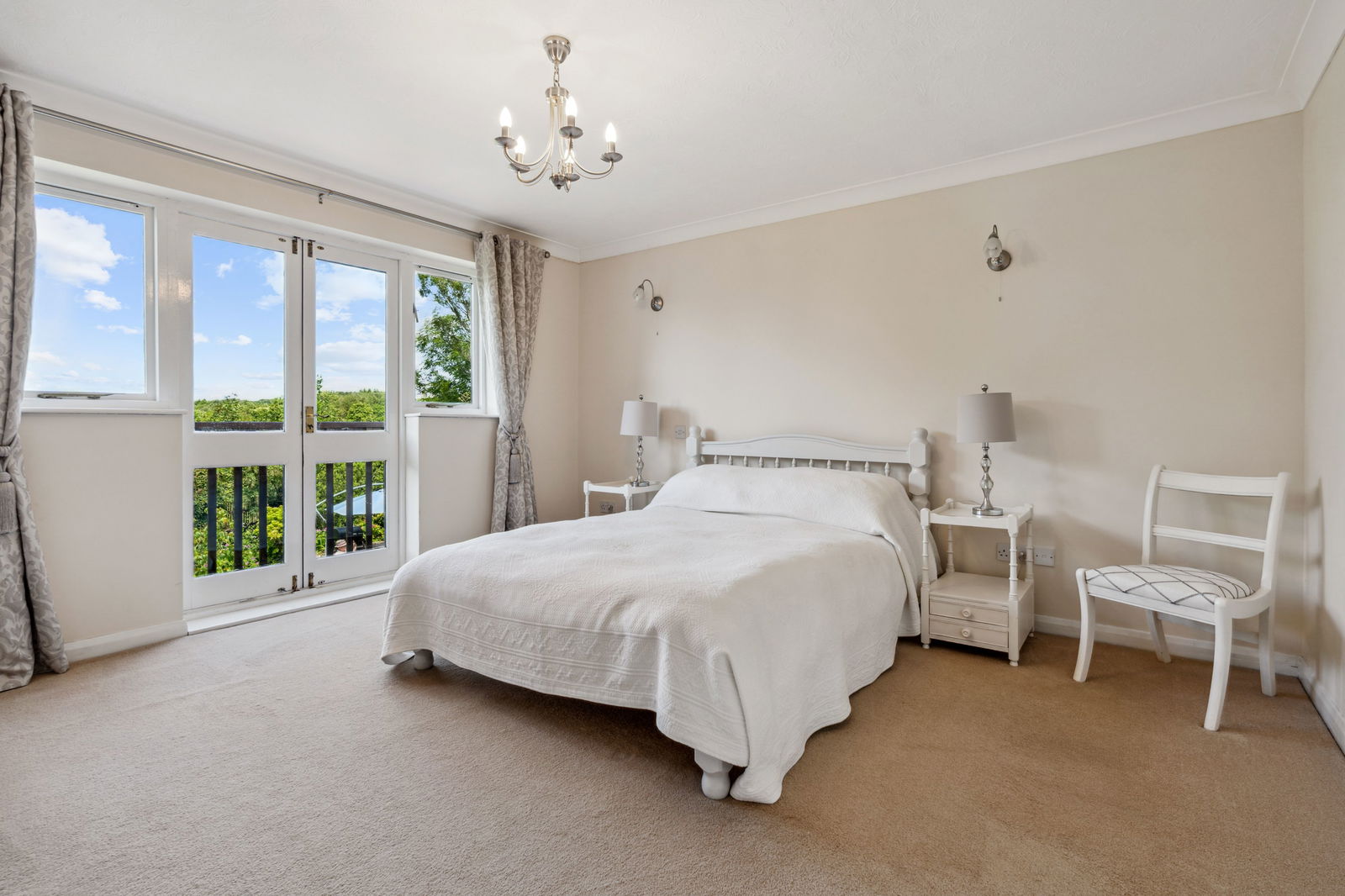 A stunning bedroom with double glazed window, radiator and double doors opening on to