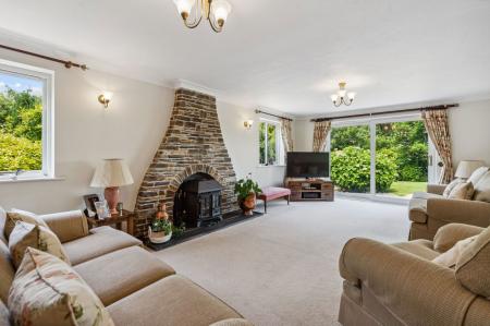 A spacious and light dual aspect living room with 2 double glazed windows to side and UPVC double glazed sliding doors opening on to the patio and rear garden. Feature fireplace with stone surround and slate hearth with woodburning stove, 2 radiators, opening to