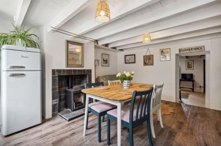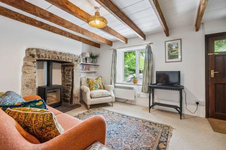 Stunning feature fireplace with recently fitted woodburning stove and former cloam oven set on slate hearth. UPVC double glazed window to front, modern electric radiator. Stairs to first floor.