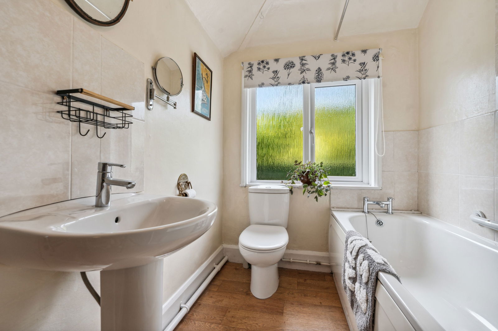Part tiled comprising panelled bath with shower over, low level W.C., wash hand basin, heated towel rail, opaque UPVC double glazed window to rear, airing cupboard housing immersion tank.