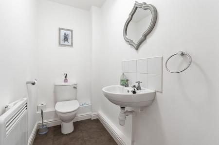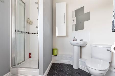 Modern fitted shower room with shower cubicle. Low level w.c. Wash hand basin. Heated towel rail with tiled splashback. UPVC double glazed opaque window to front with secondary glazing.