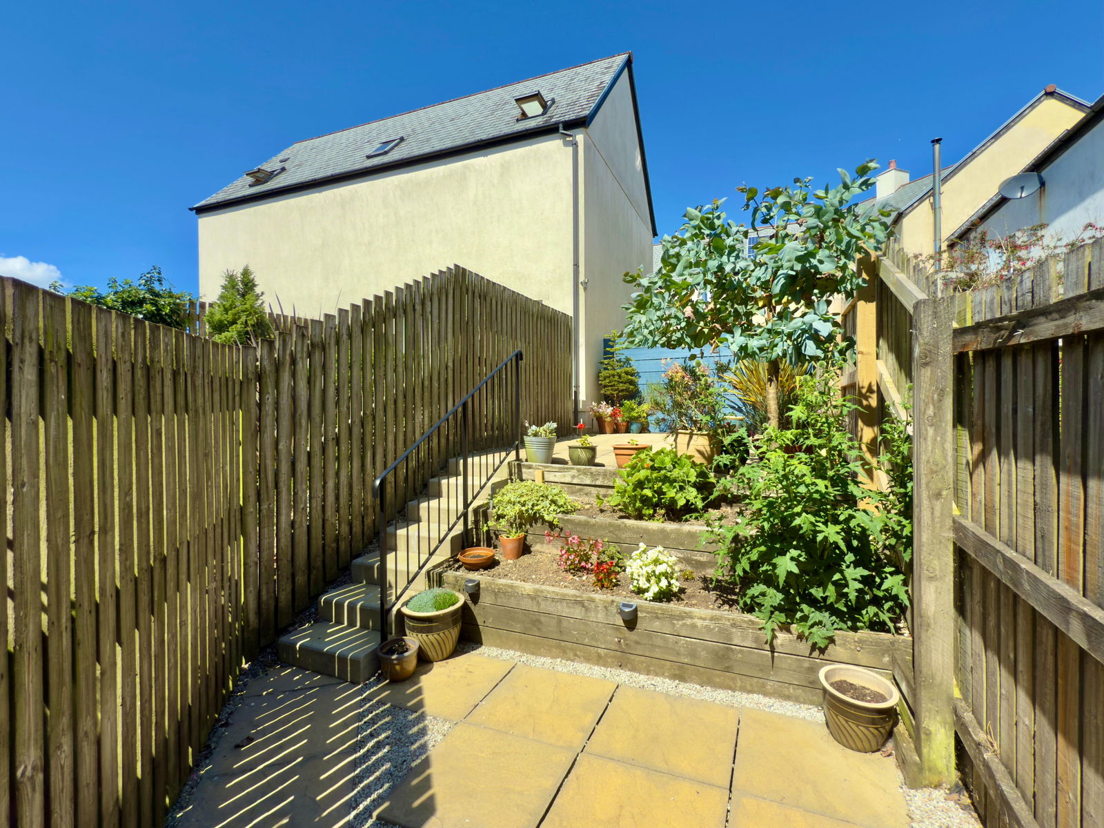 An immaculately presented rear garden which is in 2 tiers. A lovely lower patio area with chippings to side. Outside tap with 2 attractive planters and steps leading to upper garden, again with a lovely sunny patio space. Pedestrian door to