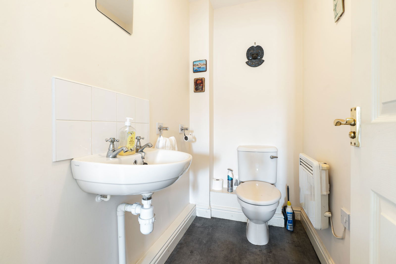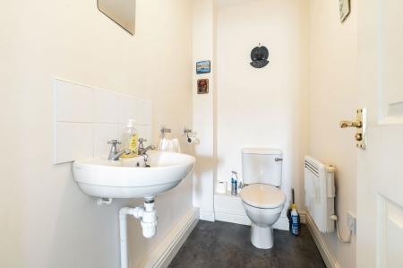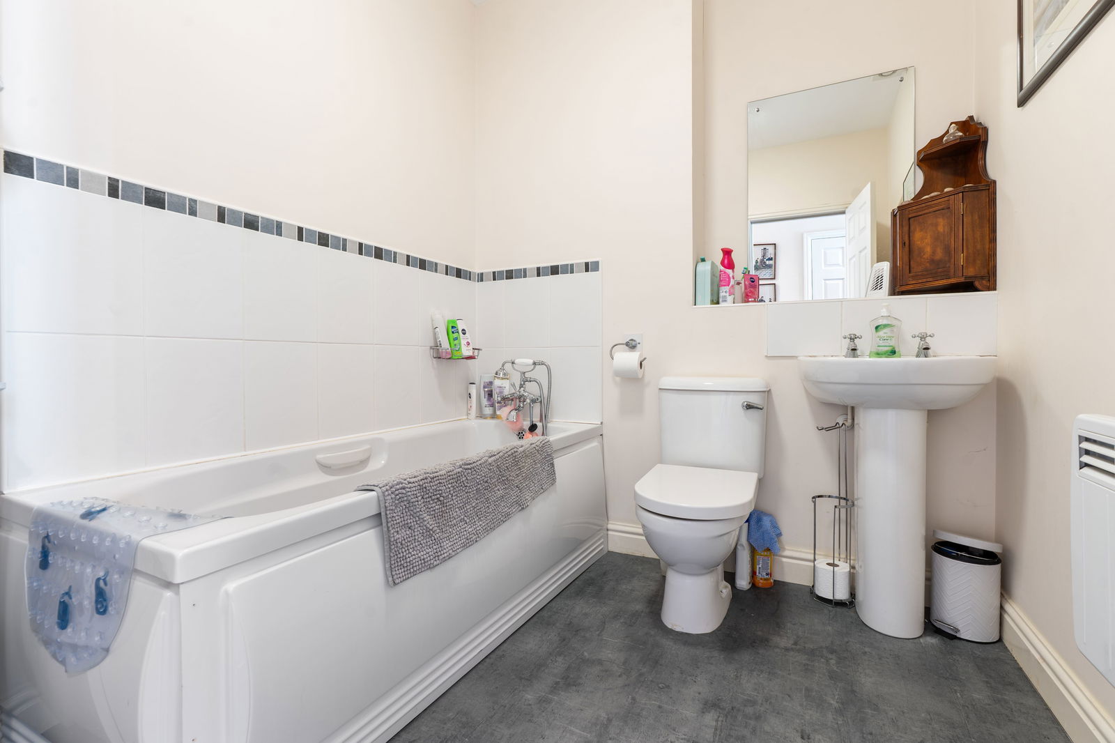 Fitted in white suite comprising shower cubicle, low level w.c., wash hand basin, Dimplex electric radiator, opaque UPVC double glazed window to front.