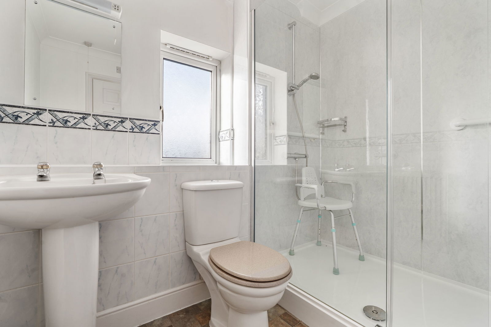 Fitted suite with large walk in shower enclosure. Low level w.c. Wash hand basin. Radiator. Opaque UPVC double glazed window to rear.