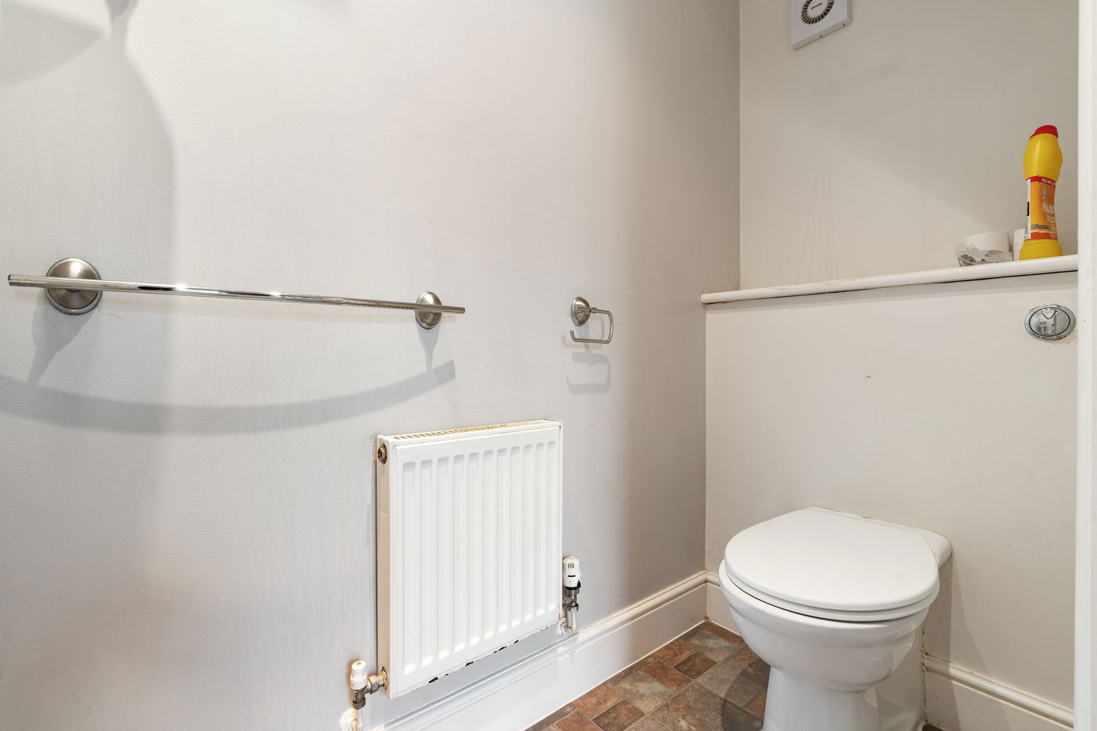 Low level w.c. Wash hand basin with tiled splashback. Radiator. Cloaks hanging space. UPVC double glazed window to front.