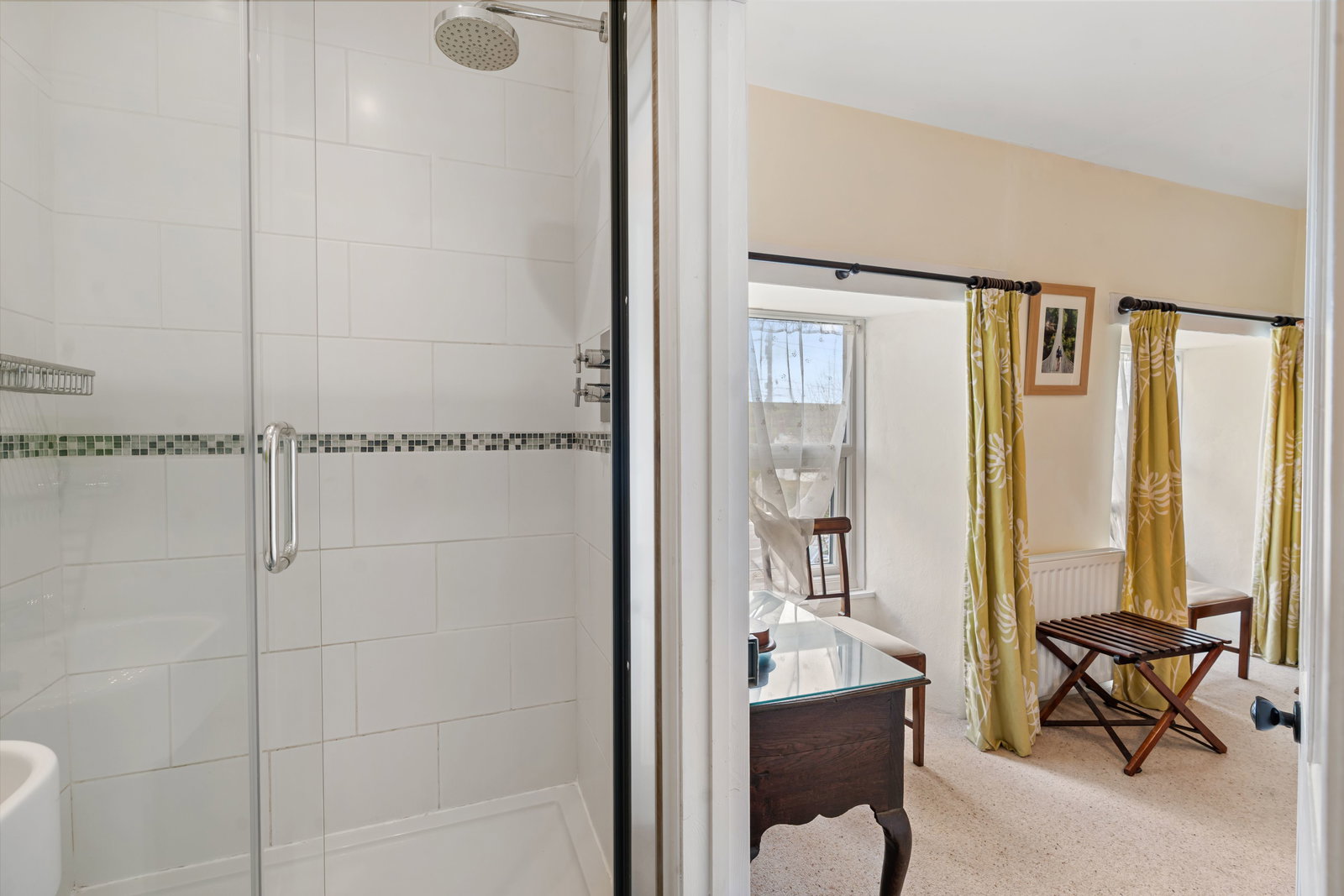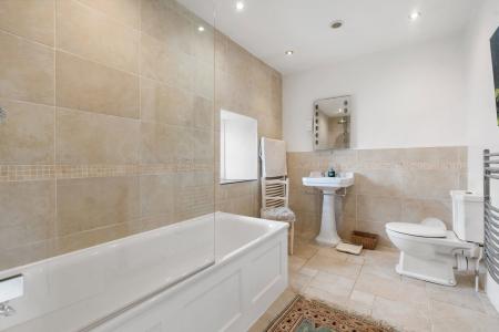 A large tiled suite comprising panelled bath with shower over with rainfall shower head. Opaque UPVC double glazed window to rear. Low level w.c. Wash hand basin. 2 heated towel rails. Radiator.