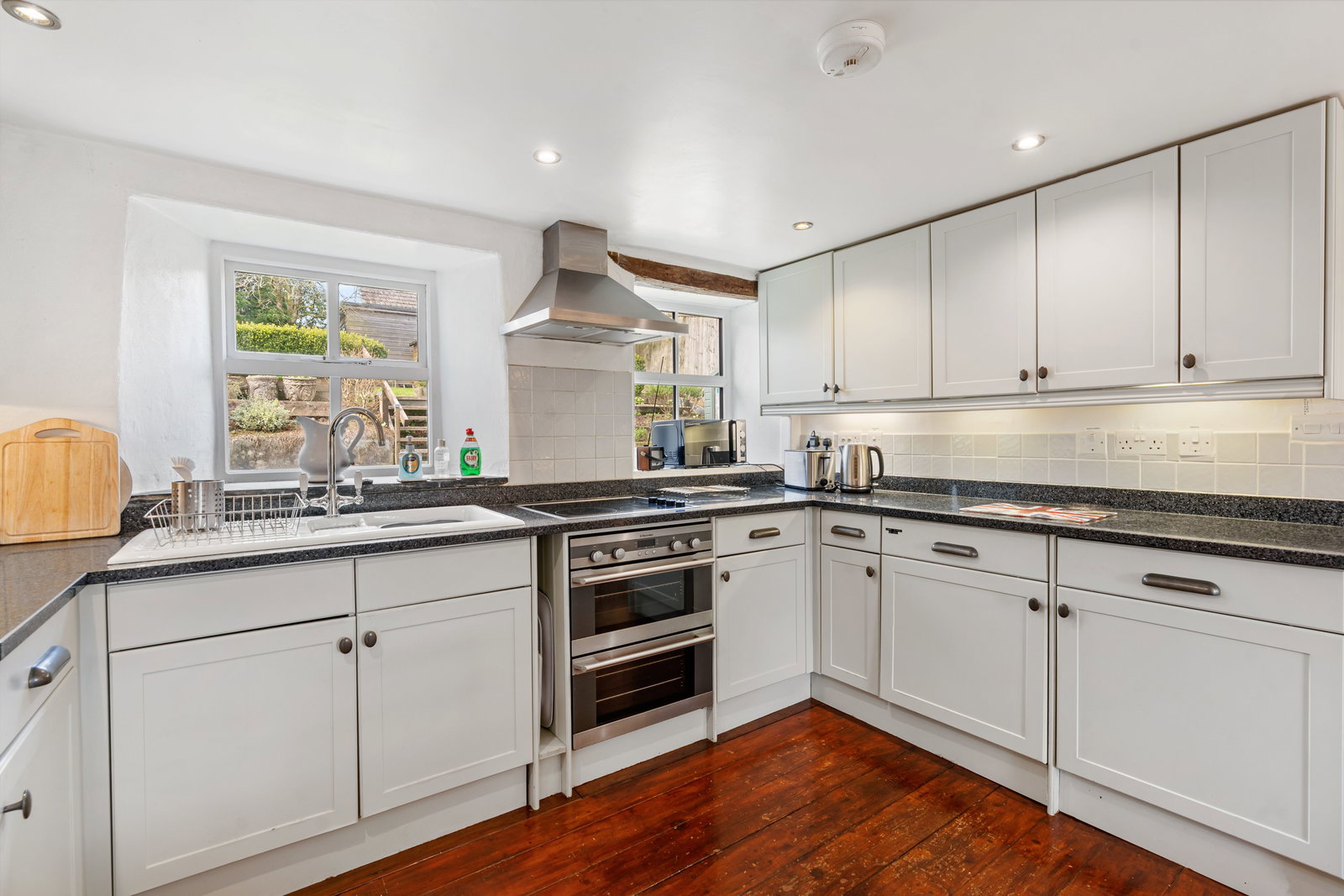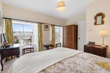 A beautifully presented dual aspect room featuring UPVC double glazed window to front (with window seat) and rear. Further timber window to rear. Modern fitted kitchen with excellent range of wall and base cupboards with drawers and worktops over. One and a half bowl sink with mixer tap over. Integral double oven with grill, 4 ring hob and extractor fan over. Integral dishwasher and integral fridge. Radiator. Feature granite fireplace with woodburning stove. Attractive wooden flooring. Feature former bread oven.