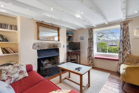 A lovely light living room with UPVC double glazed window to front with feature window seat. Feature fireplace with open fire on slate hearth and granite lintel above. Radiator. Alcoves providing storage. Beamed ceiling.