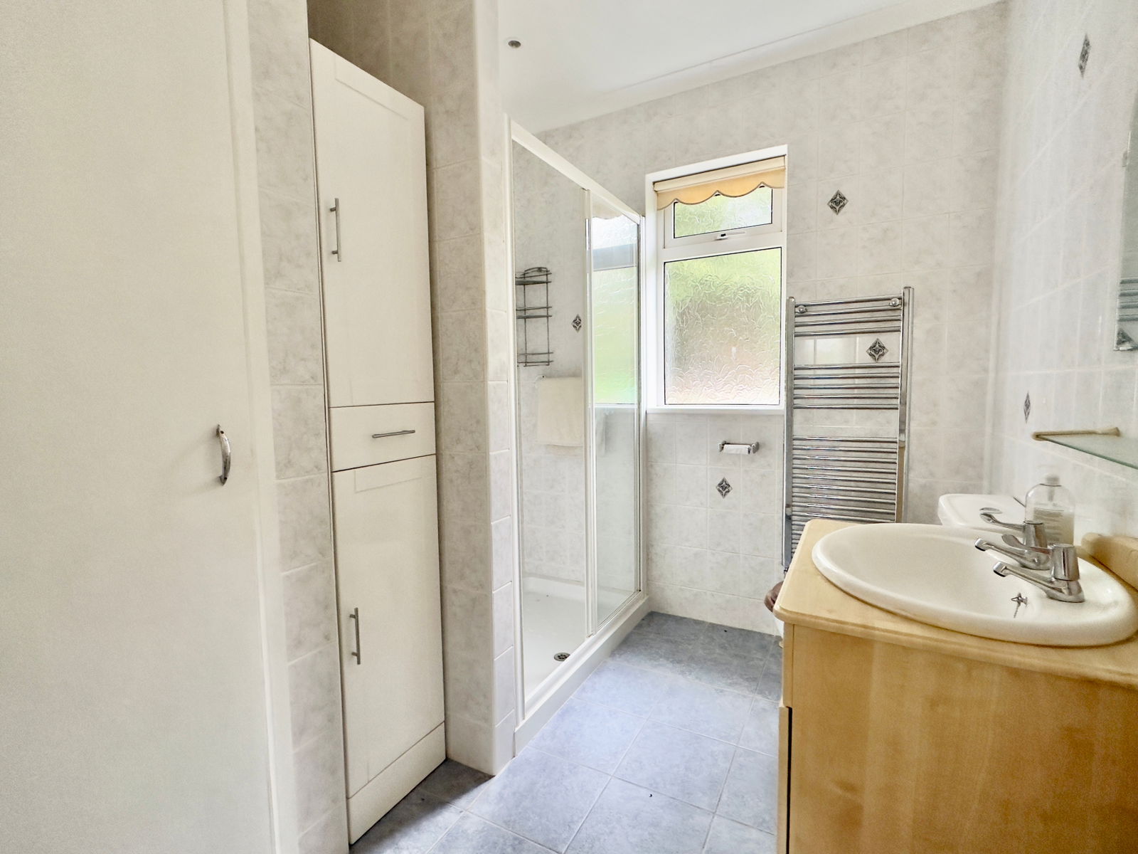 Double shower cubicle with electric shower over, wash hand basin with built-in storage cupboards, W.C., UPVC double glazed window to rear, radiator, storage cupboard.